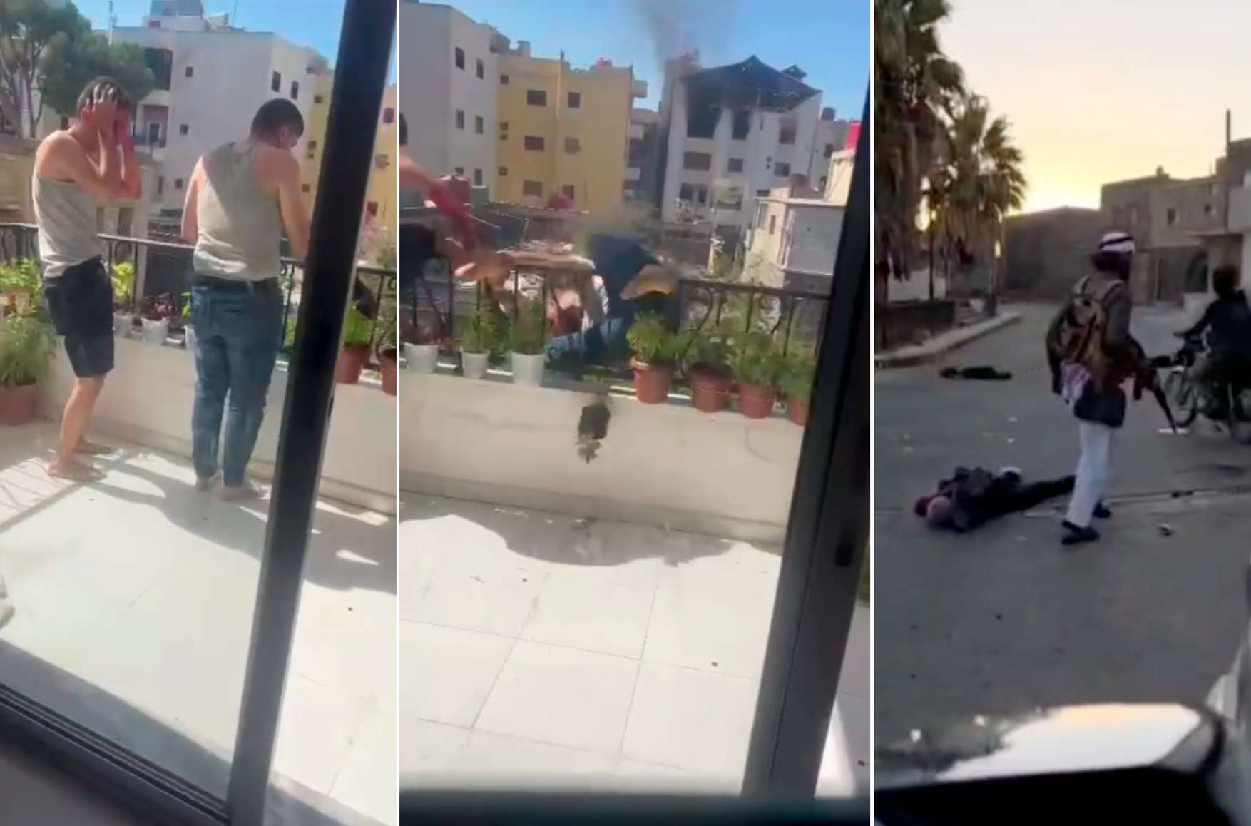 На юге Сирии продолжаются вооруженные столкновения между друзской общиной, бедуинами и правительственными силами. В Telegram-каналах появился ролик, на котором, как утверждается, представители режима аш-Шараа под дулом заставляют троих местных друзов прыгать с балкона, стреляя в момент, когда они забираются на перила.