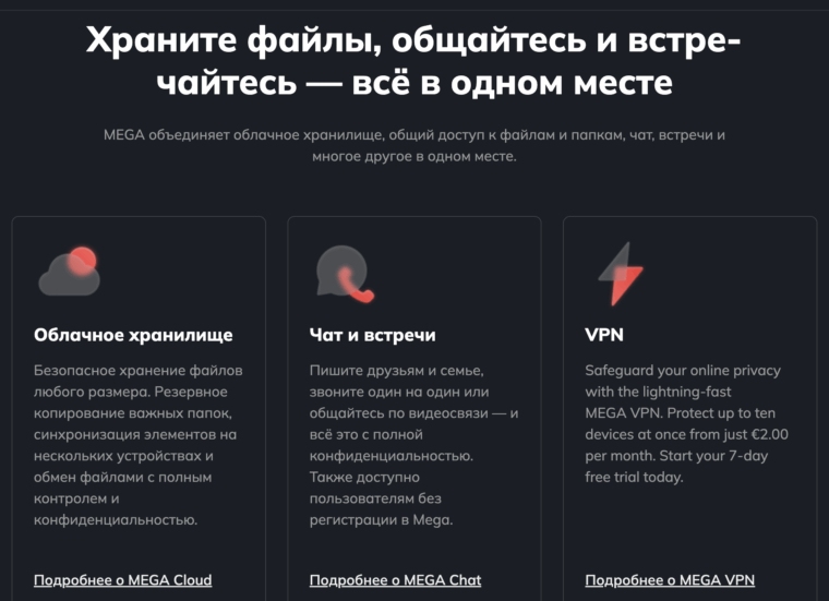 Главная страница сервиса Mega.nz
