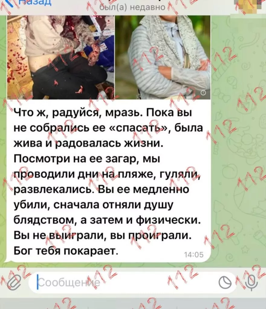 Там было написано: «Что ж, радуйся, мразь. Пока вы не собрались ее “спасать”, была жива и радовалась жизни. Посмотри на ее загар, мы проводили дни на пляже, гуляли, развлекались. Вы ее медленно убили, сначала отняли душу блядством, а затем и физически. Вы не выиграли, вы проиграли. Бог тебя покарает».