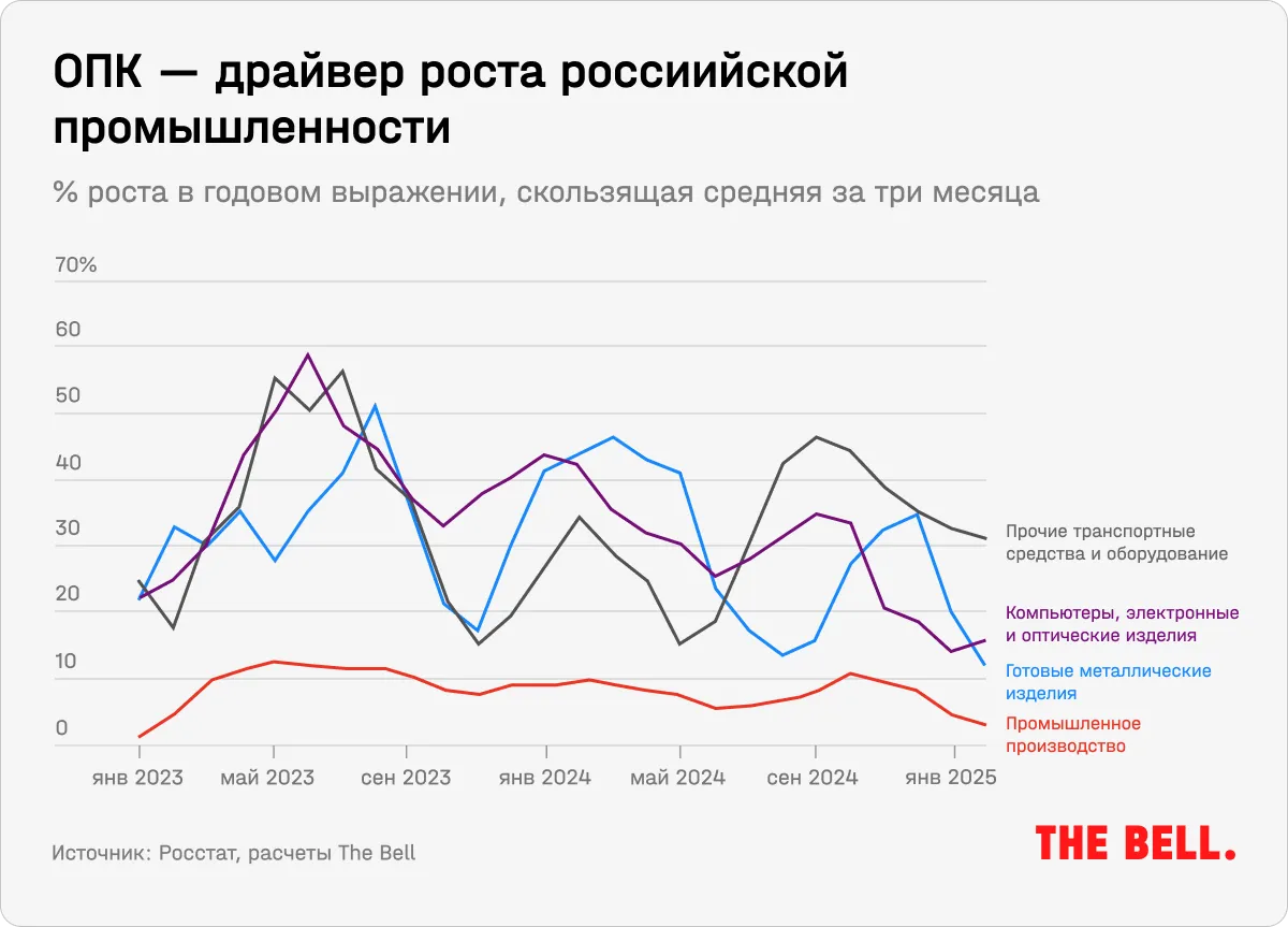 Один из главных аргументов Минобороны, которое теперь возглавляет экономист Андрей Белоусов, состоит в том, что оборонная промышленность сейчас — это главный драйвер экономики. За первые 6 месяцев 2025 года рост промпроизводства замедлился до 1,4% в годовом выражении, причем добывающая промышленность упала на 2,4%, а обрабатывающая — выросла на 4,2%. Рост в обработке идет за счет «специальных» отраслей, преимущественно связанных с ВПК. Выпуск же в гражданской промышленности снижается.