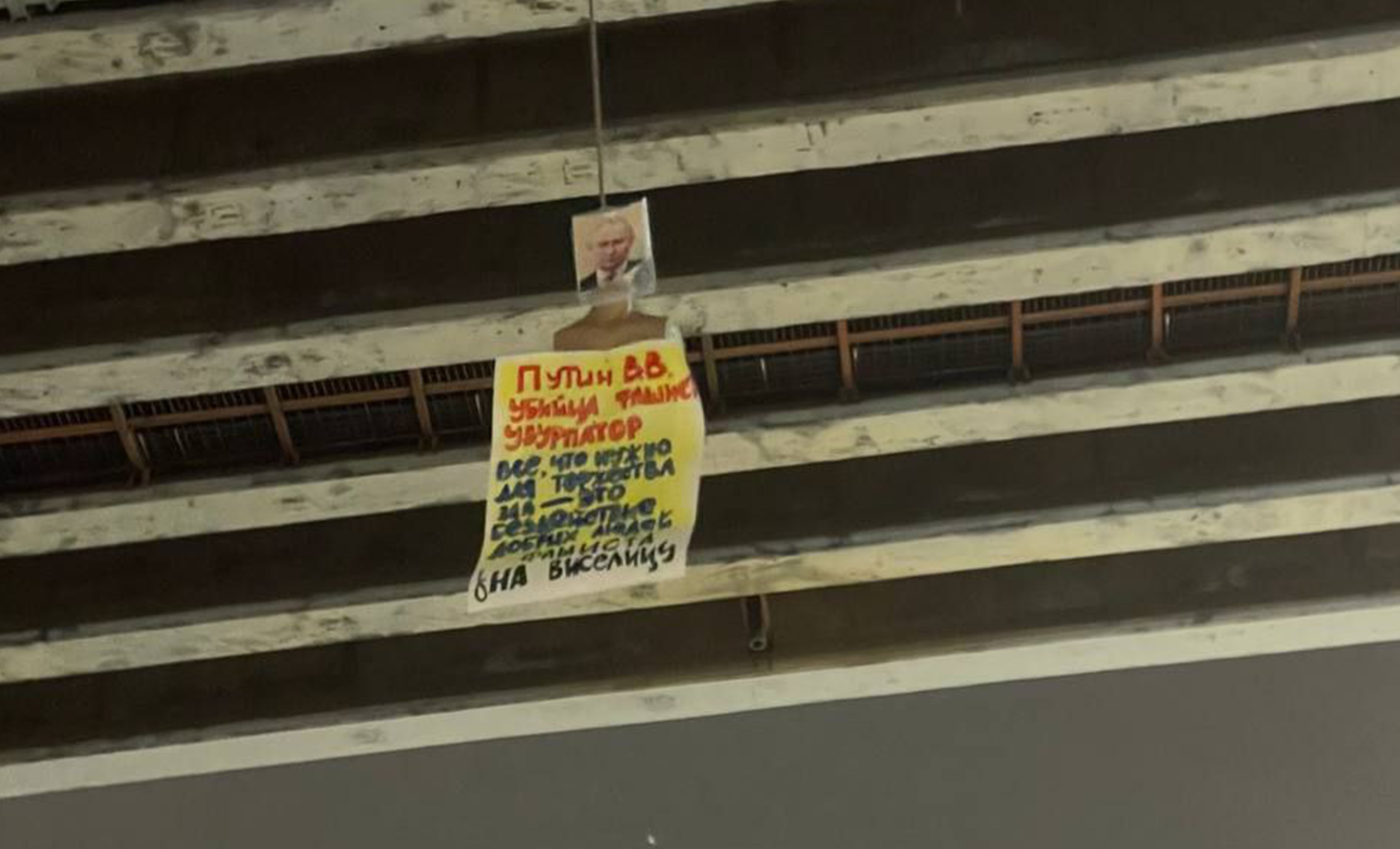 «Путин В.В. убийца фашист узурпатор» — написано на желтом фоне красными буквами, а сверху на скотче — фото Владимира Путина. «Все что нужно для торжества зла это бездействие добрых людей/фашиста на виселицу», — написано на плакате ниже.