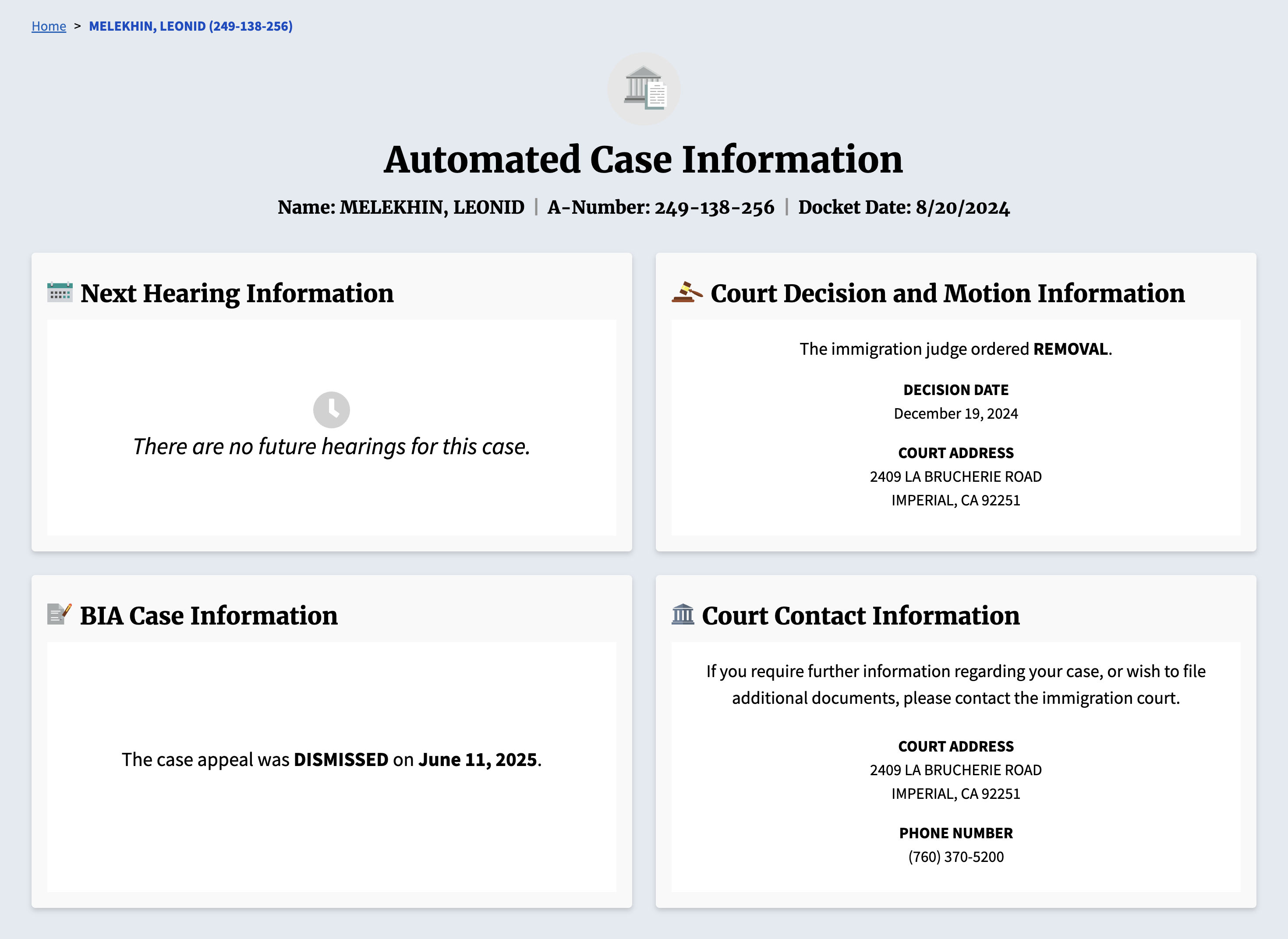 Карточка миграционного дела Леонида Мелехина на сайте Минюста США