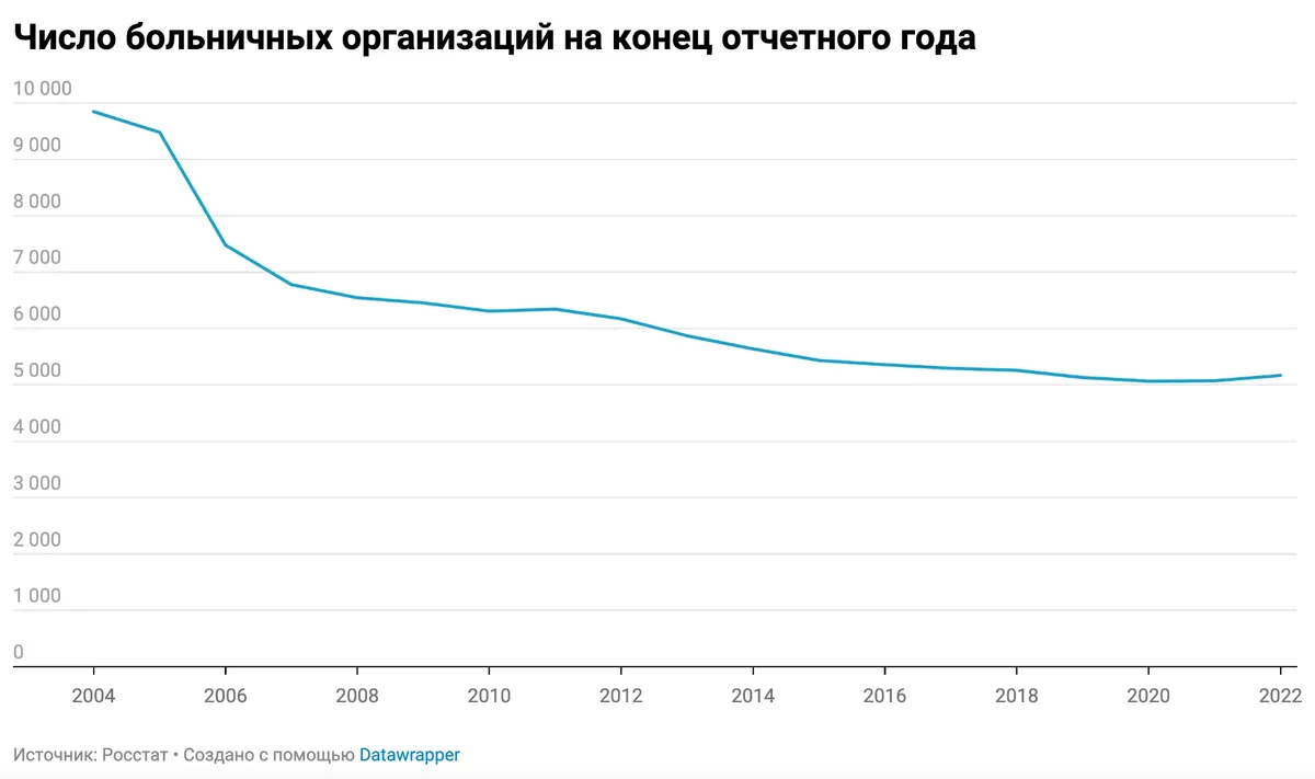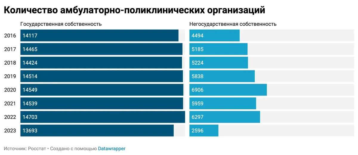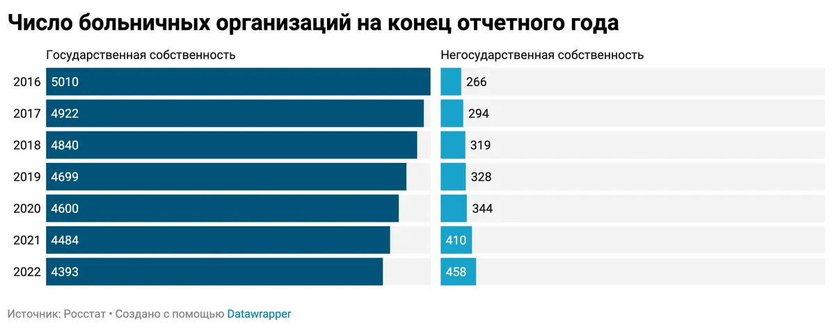 Общее число больниц в стране, повторим, за два десятилетия «оптимизации» сократилось в два раза. Но если судить по данным с 2016 года, закрывались именно государственные клиники. Число частных росло так, что суммарно количество больниц в стране к 2022-му почти не изменилось. А открыть в России частный стационар очень нелегко.