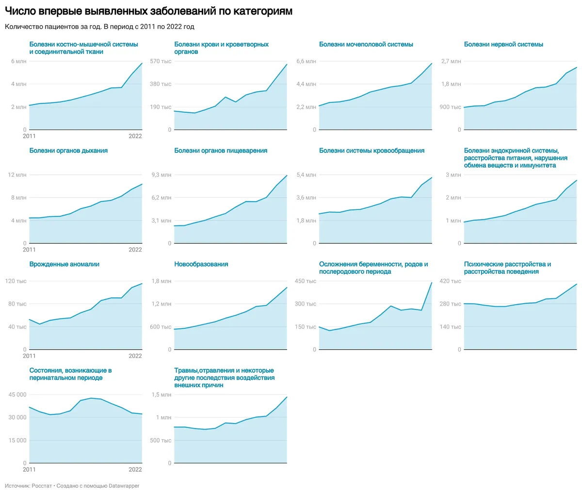 Мы лишь видим, как растет число людей, которым впервые поставили какой-то диагноз: с 22 миллионов пациентов в 2011 году до 58 миллионов в 2022-м. В онкологии количество заболевших выросло за эти годы втрое.
