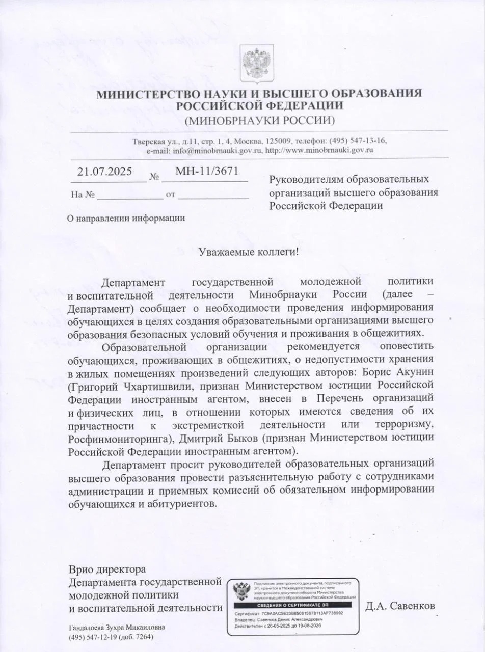 Писатель Борис Акунин выложил скан документа якобы от Минобрнауки с комментарием: «Красивое». В документе говорится о рекомендации российским студентам не хранить в общежитиях книги Акунина и Быкова. Откуда у него этот документ — писатель не пояснил.