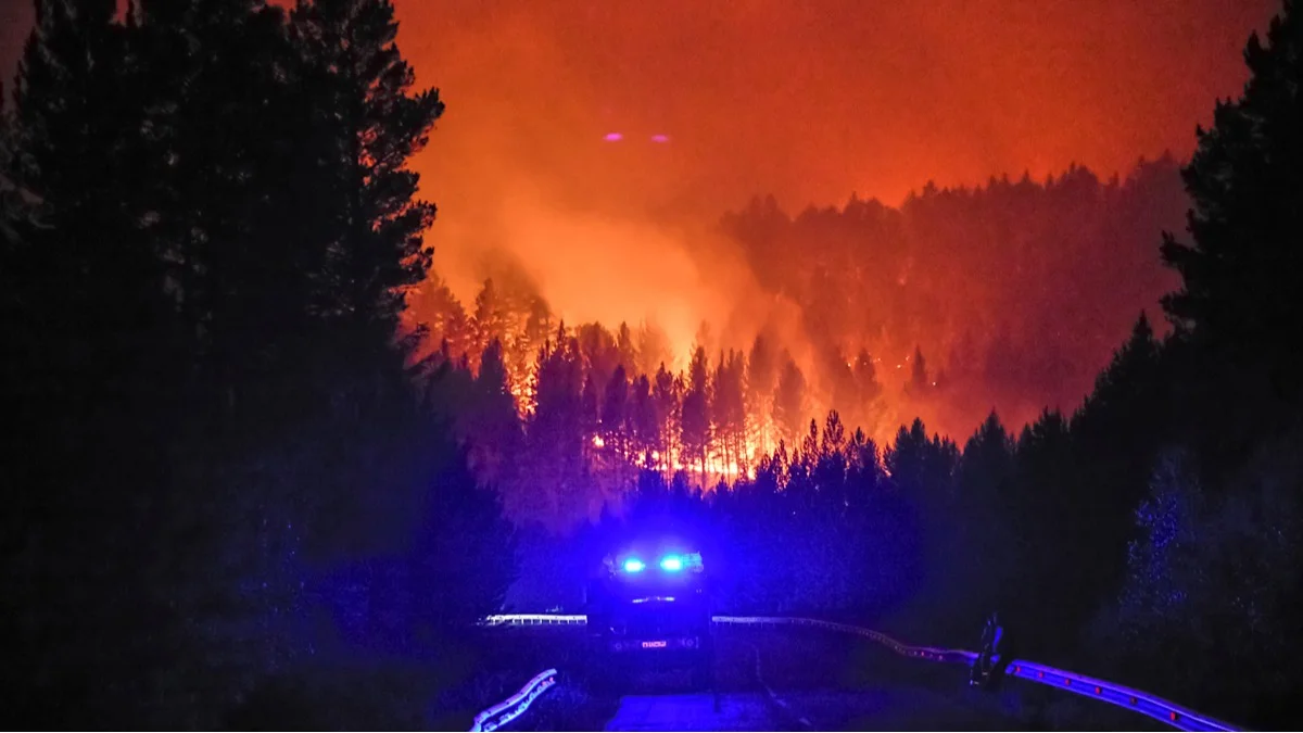 Пожарная машина на фоне горящего леса возле Атамановки, 23 июня 2025 года. Фото: AP Photo / Scanpix / LETA