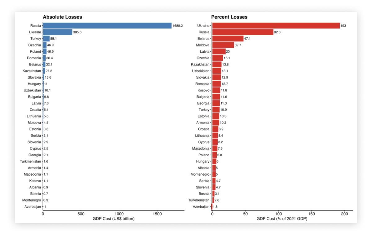 Совокупная стоимость войны в $2,44 трлн для 29 стран, попавших в выборку, эквивалентна потере 44,95% их совокупного ВВП в 2021 году, пишут Городниченко и Васудеван. В относительном выражении больше всего должна была потерять Украина — 193% ВВП, или $386 млрд за шесть лет. Абсолютные потери России могли оказаться максимальными и составить $1,69 трлн.