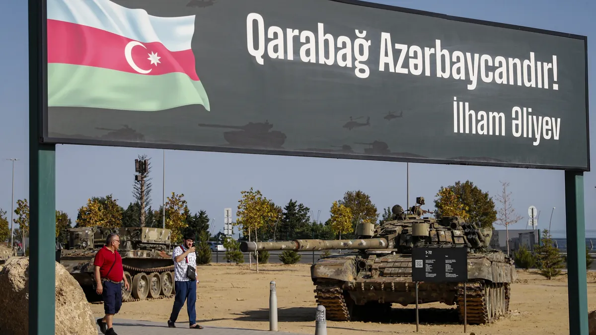 A sign reads ”Karabakh is Azerbaijan!” at a park displaying military trophies from the second Karabakh war, in Baku, Azerbaijan, 5 September 2023. Photo: EPA / MAXIM SHIPENKOV