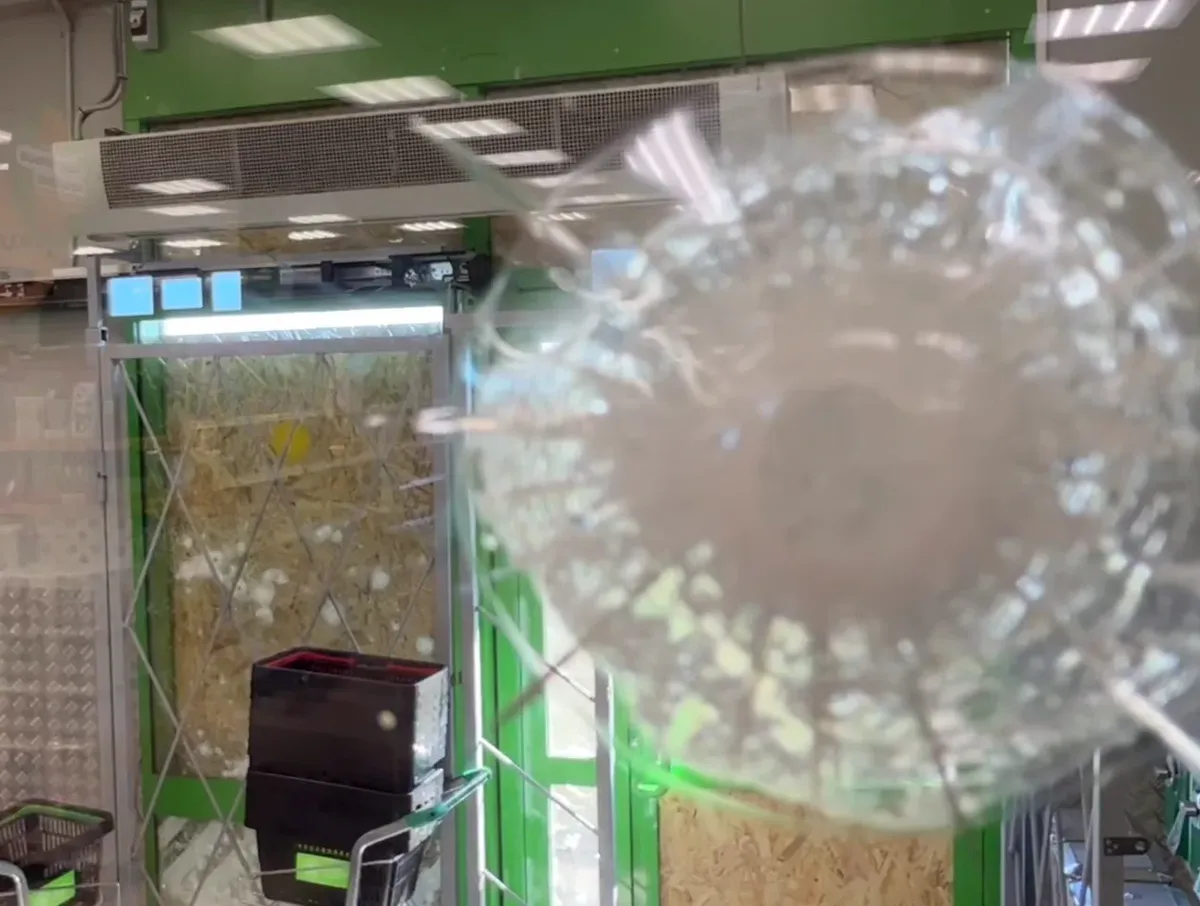 Окна магазина частично закрыты фанерным листом, у входа стоят несколько бетонных блоков, но проход в магазин свободный, и незащищенность не понравилась губернатору. Рядом на парковке стоит бетонное укрепленное укрытие — со следами ударившей по нему шрапнели.