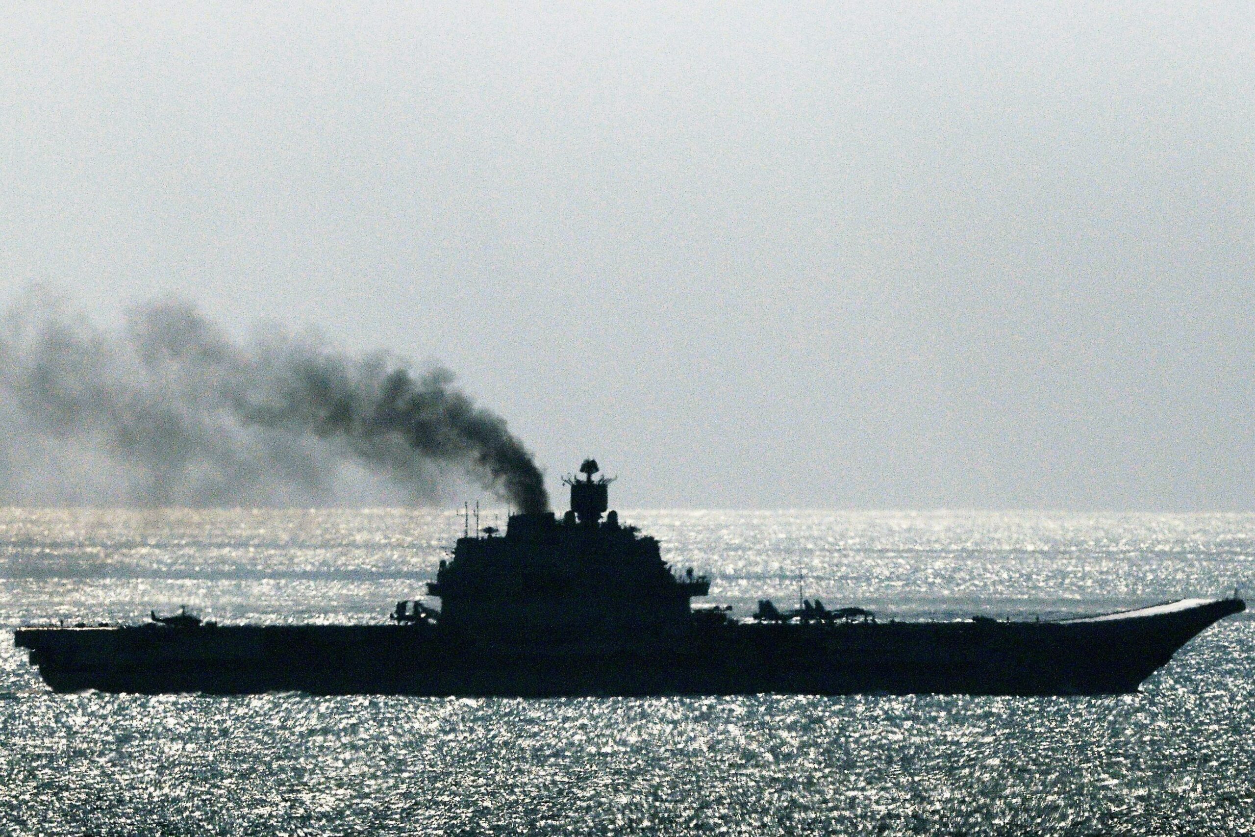 Фото: Российский авианосец «Адмирал Кузнецов» проходит через пролив Дувр, направляясь к побережью Сирии, чтобы принять участие в осаде Алеппо, 2016 год. PA Images via Reuters
