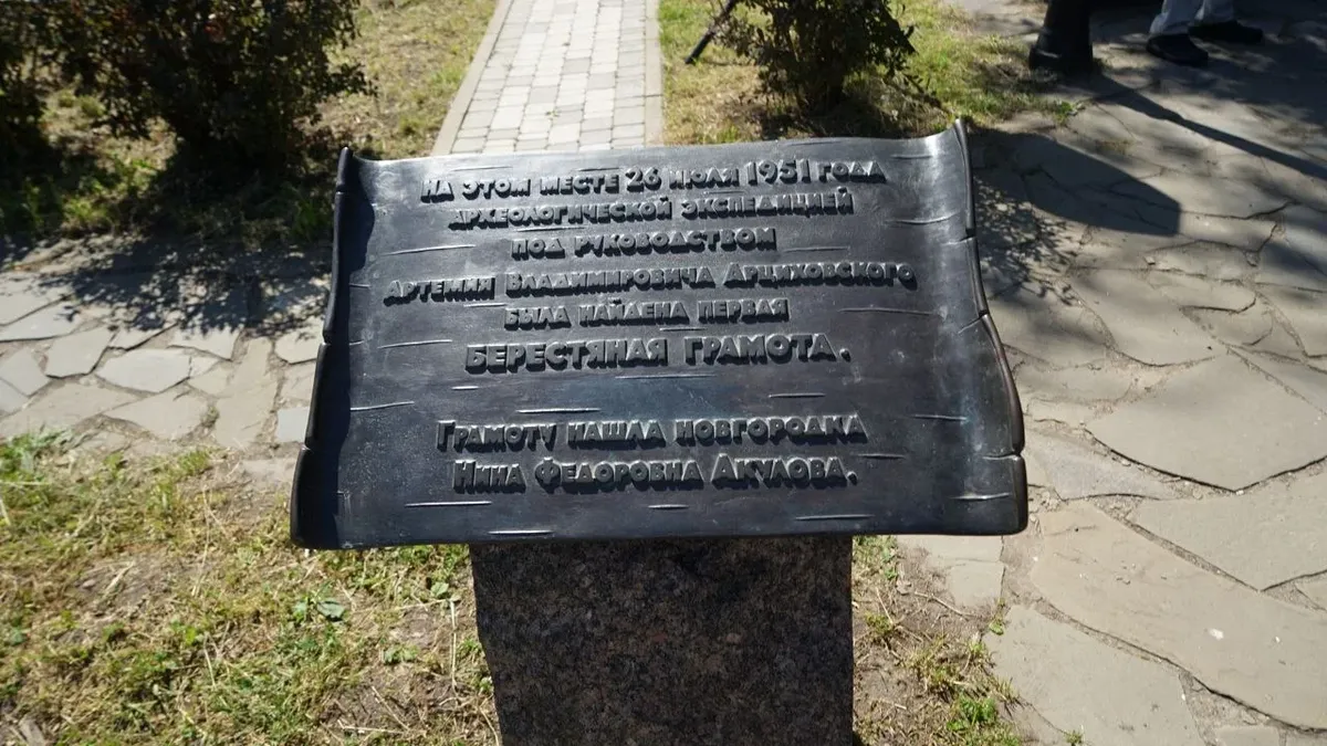 Они поставлены на том месте, где между плахами настила мостовой древней Холопьей улицы летом 1951 года 30-летняя новгородка Нина Акулова, работница мебельного комбината, нашла грамоту № 1 — роспись доходов с нескольких сел в пользу некоего Фомы. Лингвисты считают, что та была написана в 1380–1400 гг. Нина Федоровна вместе с подругами в отпуске решила подработать на Неревском раскопе подсобной рабочей. И с 2006 года на доме 17, корп. 1 по Десятинной улице, где она жила, установлена табличка ее памяти.