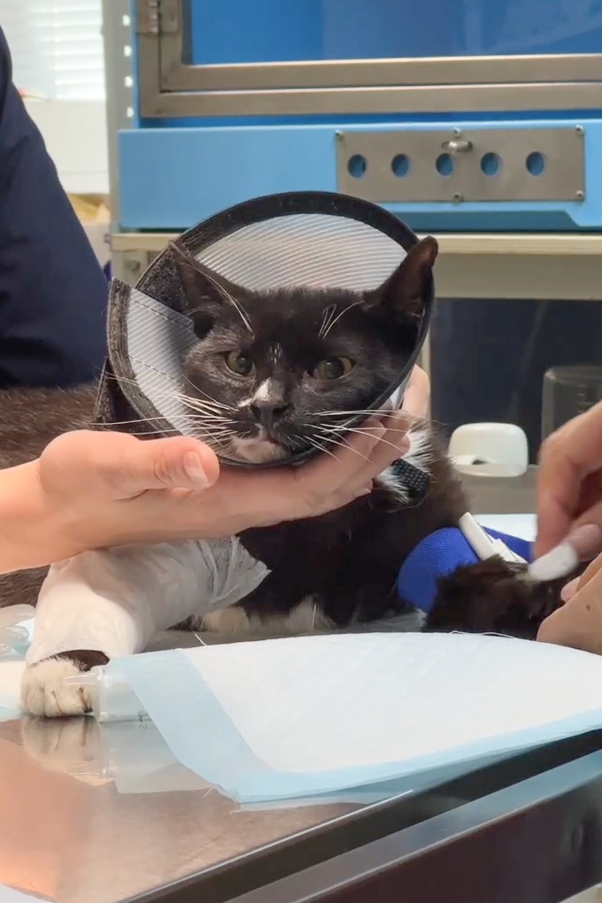 После спасения мы сразу отправились в медклинику. Там у котика взяли анализы, сделали уколы, перевязали и сделали операцию на лапу. У него была рваная рана, а в отверстии, где он сидел, была высокая влажность, и рана не могла затянуться.