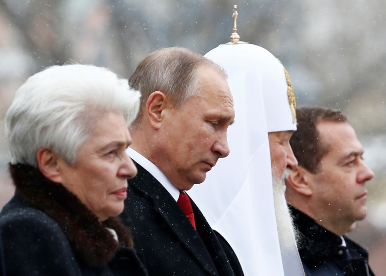 Наталья Солженицына, Владимир Путин, патриарх Кирилл и Дмитрий Медведев на церемонии открытия памятника Владимиру I, 4 ноября 2016 года