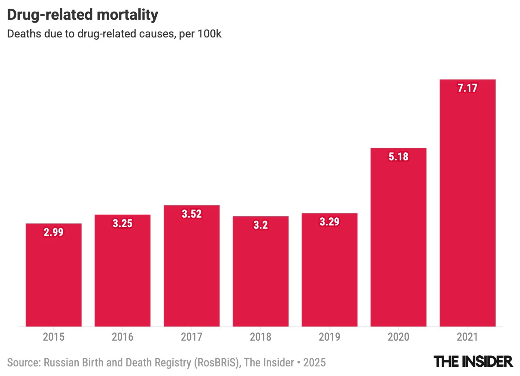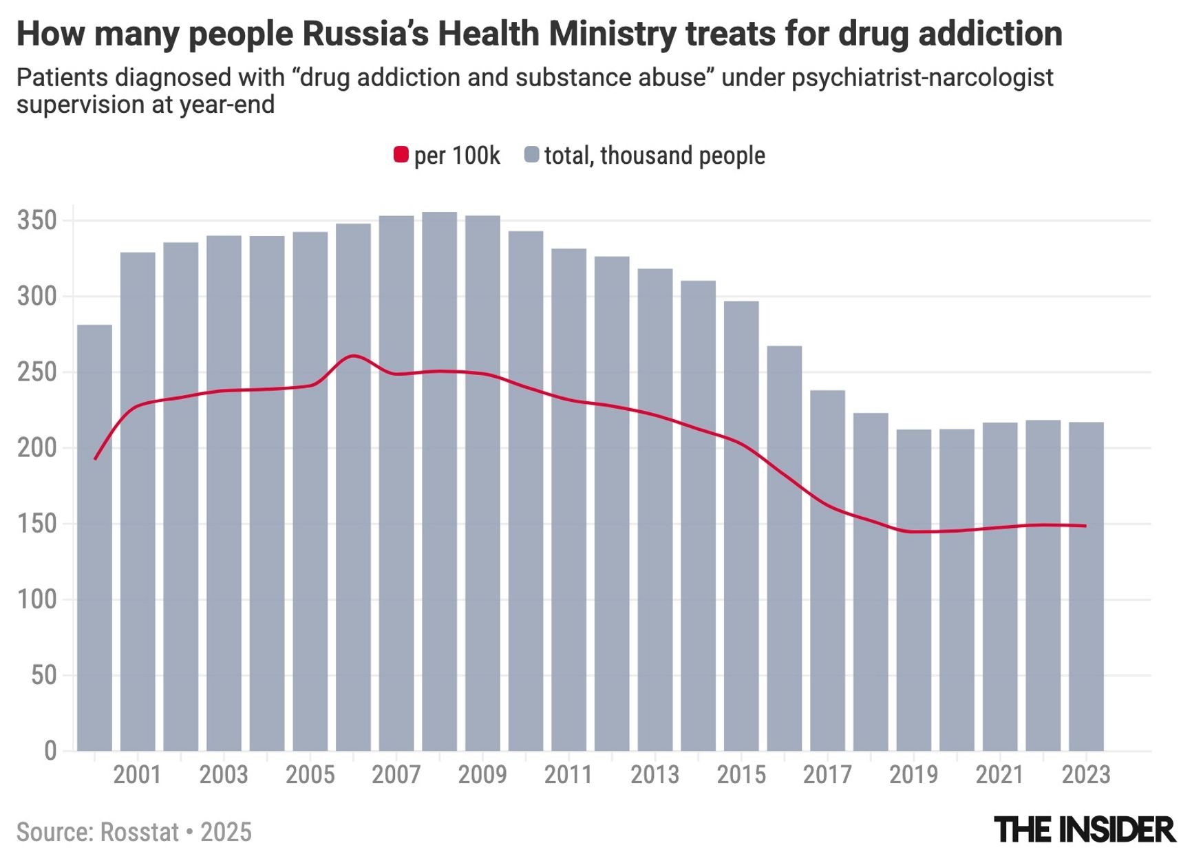 Data on those seeking medical treatment do not include patients at private clinics, meaning that while official documents speak of a decline in the number of patients at public narcology centers, the actual number is likely increasing. Drug-related mortality is also rising. The Insider analyzed data from the Russian Birth and Death Registry (RosBRiS) showing that over 10,000 people died from drug use in 2021 — a 2.4-fold increase compared to 2015.