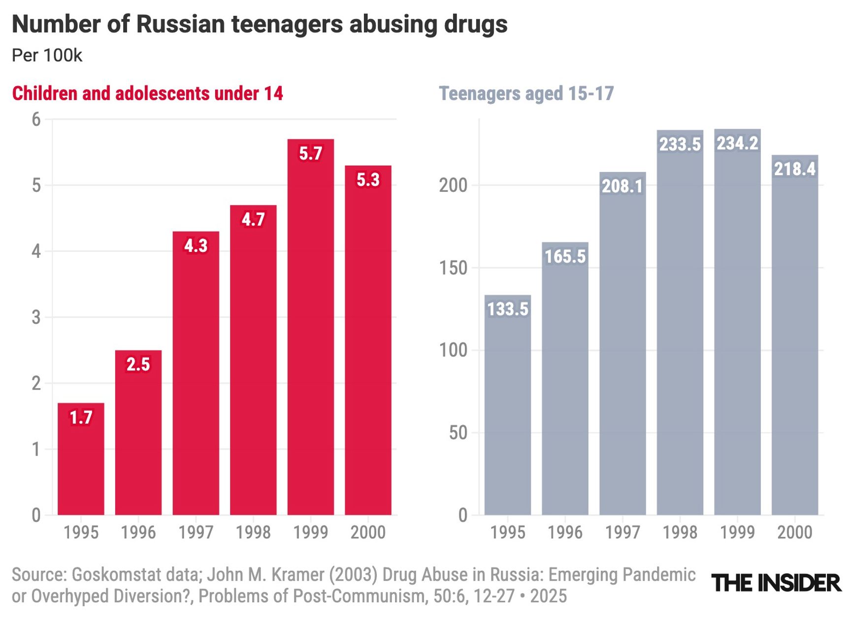 The scare stories that built Bryun’s career as Moscow’s — and eventually Russia’s — chief narcologist were not backed by data. According to a report by Russia’s State Statistics Committee (Goskomstat), in 1995 only 13 out of every 10,000 teens aged 15-17 actually used drugs. By 2000, the number rose to 22 per 10,000, or 0.2%. That’s 100 times less than the “one in five” figure Bryun claimed.