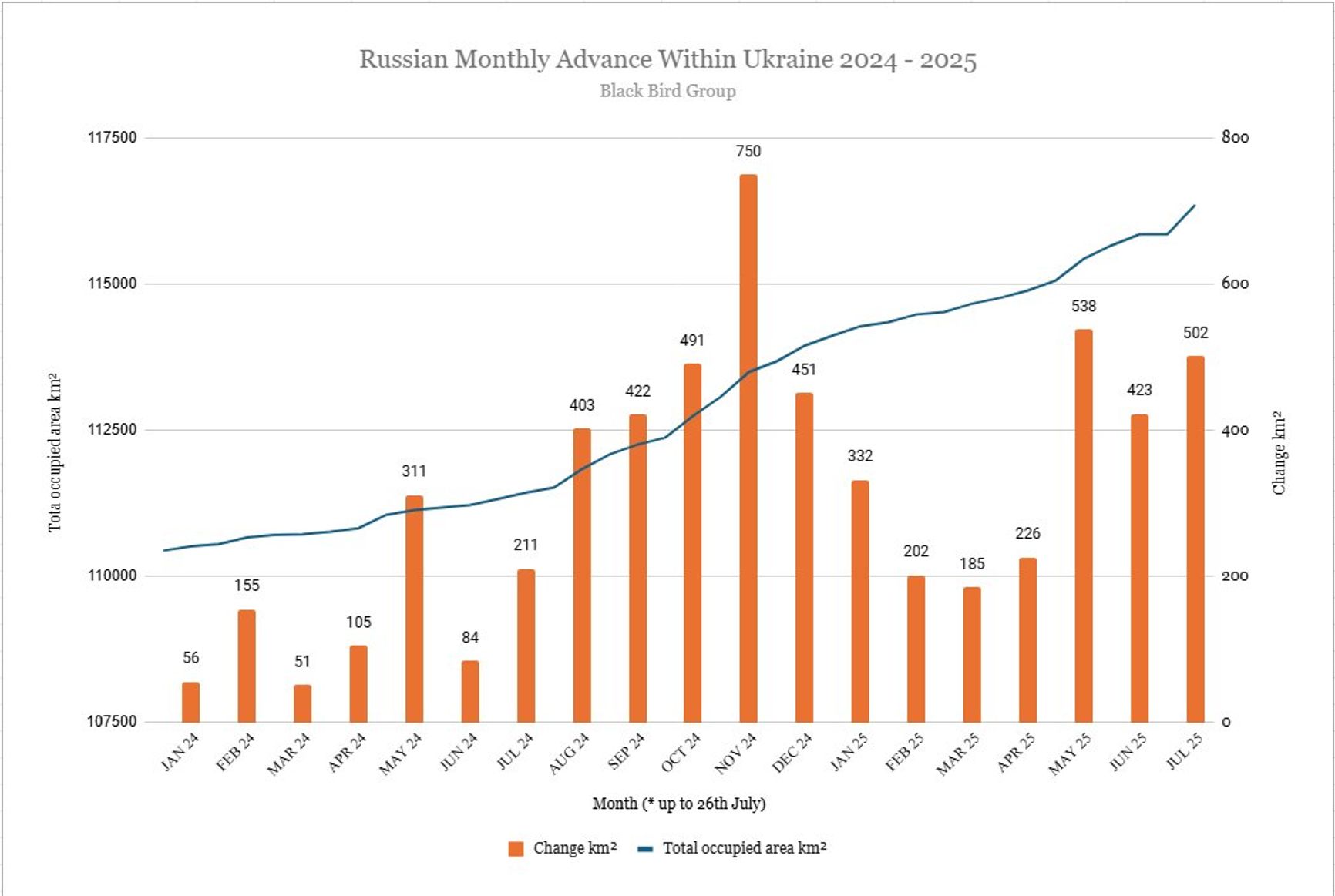 Наконец, согласно подсчетам OSINT-сообщества Black Bird Group, в июле российские силы захватили 502 км² украинской территории (в июне — 423 км²).