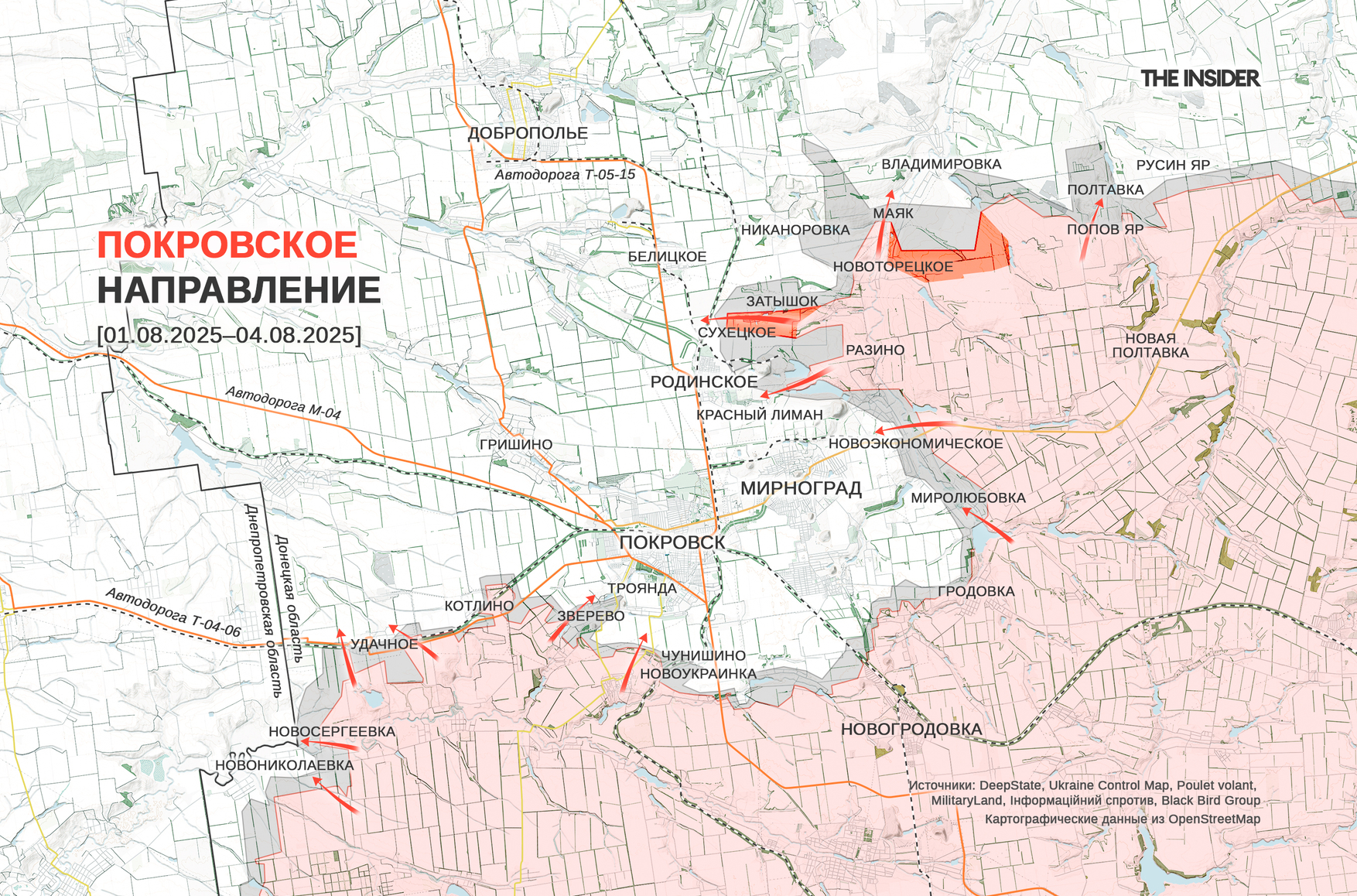 «Сливочный каприз» геолоцирует кадры с перемещением российского военнослужащего около лесопарка в южной части Покровска, а также видео огня СОУ по одной из позиций противника, отмечая выход ВС РФ к окраине Красного Лимана на восточном фланге направления. Кроме того, появилось видео с российским флагом в Новоукраинке к югу от Покровска (о захвате этого населенного пункта Минобороны РФ сообщало 29 июля 2025 года). «Сливочный каприз» подтверждает геолокацию видео.