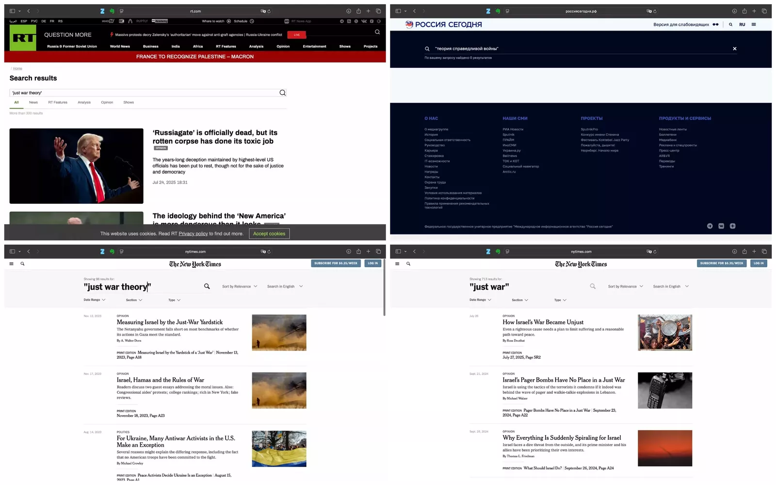 Аналогично не упоминает теория справедливой войны или концепция справедливой войны на русскоязычном портала Берлинского фонда Карнеги и крупнейшего оппозиционного медиа — телеканале «Дождь».