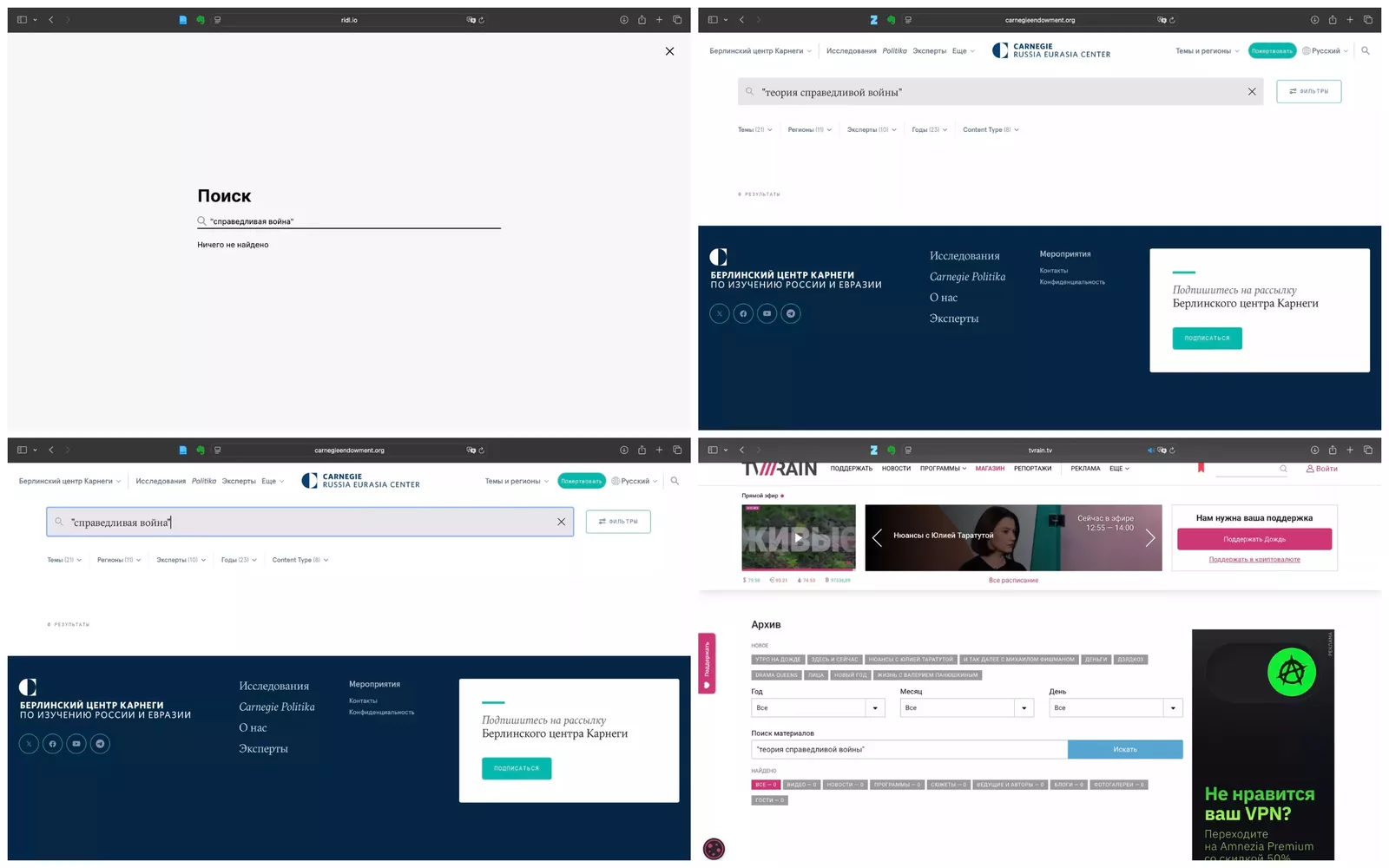 Поиск по ключевым словам на порталах Riddle Russia, Carnegie и телеканала «Дождь» / Скриншоты автора