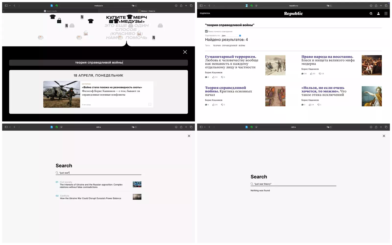 Еще ниже приведу скриншот поиска по ключу «теория справедливой войны» на портале издания «Медуза». Наглядно видно, что за весь многолетний период русско-украинской войны не появилось ни одного текста строго связанного с данной теорией. (Здесь же представлены скриншоты порталов Republic и Riddle Russia — Прим. ред.).
