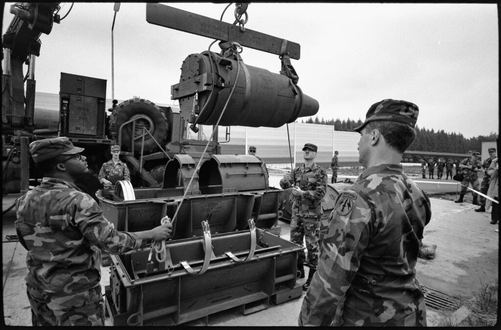 Американские солдаты под Штутгартом разбирают ракету средней дальности Pershing II и грузят детали в транспортировочные контейнеры. 8 июня 1988 года. REUTERS/Wolfgang Rattay