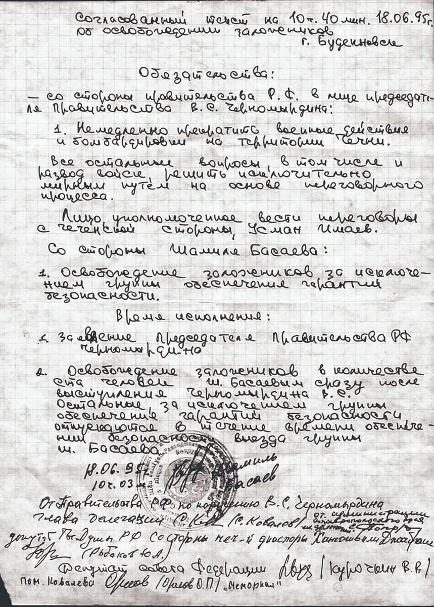 — В реальности женщин и детей отпустили далеко не сразу. Басаев хотел получить гарантии. Мы предложили обмен, женщины и дети уходят, мы остаемся до конца. Ковалев снова позвонил Гайдару, тот связался с Черномырдиным. Через некоторое время премьер-министр перезвонил сам и подтвердил наши полномочия. Дальше к нам присоединились мэр Буденновска и председатель Конституционного суда Чеченской Республики. У нас был примерный текст соглашения, составленный на основании требований, выдвинутых Басаевым в телефонных переговорах. Добиться его согласования всеми сторонами было достаточно трудно — так, из подписанного главой правительства документа внезапно выпал пункт о том, что впредь все спорные вопросы в Чечне должны решаться мирным путем. А Басаев настаивал именно на такой формулировке. А когда это требование было выполнено, он выдвинул новое: о том, чтобы факт соглашения был озвучен по телевизору. Но нам удалось его убедить в необходимости уже сейчас отпустить женщин и детей. Ведь мы все равно останемся.