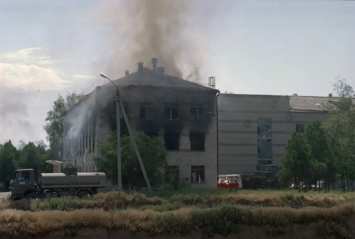 — Услышав стрельбу, поднялись на крышу, чтобы осмотреться… Потом я заметил, как внизу, в ту сторону, где идет стрельба, перебегают от здания к зданию несколько человек — у одного из них на плече камера «Бетакам». Я сбежал вниз и вместе с журналистами стал пробираться к центру событий. Уже рассвело, до больницы оставалось метров 75, и я видел, как она горит, как женщины-заложницы машут белыми платками в окнах и истошно кричат: «Не стреляйте, ради бога, здесь дети». К этому моменту спецназ уже отошел, и тогда все, что стояли в отдалении — БТР, БМП, пулеметы, снайперы, — открыли огонь по главному корпусу. Люди в окнах пропадали (одной из жертв стала беременная санитарка — когда она стояла в окне, пуля пробила ей грудную клетку, но она чудом выжила), человеческий вой стихал, но в окнах появлялись другие фигуры, и крики возобновлялись… Рядом раздался взрыв — меня спасло то, что я стоял за стеной какого-то недостроя. На земле лежал раненый офицер, рядом пыталась встать молодая женщина с фотоаппаратом… Оказалось, что снаряд прилетел с другой стороны оцепления. Неопытный наводчик стоявшего там БМП промахнулся, и снаряд упал среди своих…