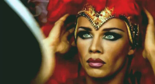 Artist Anatoly Yevdokimov is seen putting on make-up and a wig and carrying out a drag performance in a night club setting in the video to the 2002 pop song On Tebya Tseluet (“He Kisses You”).