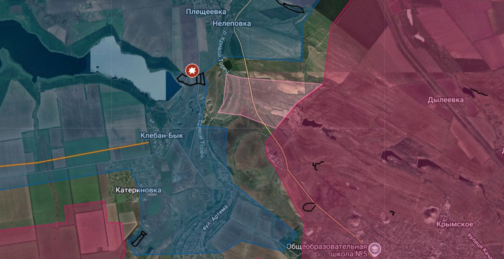 Российский военблогер Анатолий Радов сообщает, что ВС РФ существенно продвинулись к восточному берегу Клебан-Быкского водохранилища, однако украинские военные сохраняют сообщение по дамбе с населенными пунктами Клебан-Бык и Катериновка к югу от водоема.