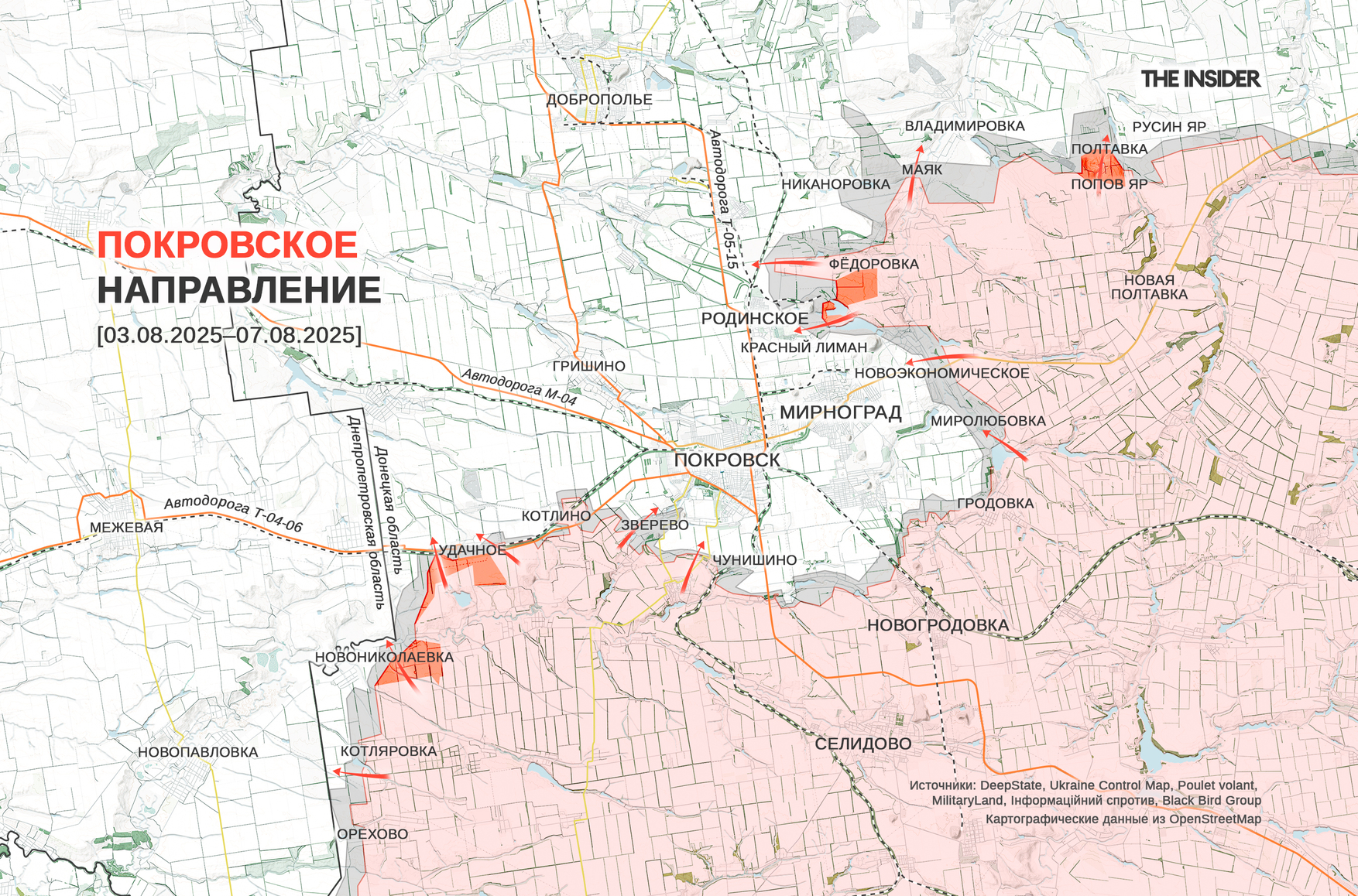 К югу и юго-западу от Покровска, как пишет Машовец, ВС РФ не могут надежно закрепиться в Звереве и Котлине, а украинским военным удалось в ходе контратаки зачистить бóльшую часть Удачного. Южнее СОУ отбросили противника от границы Днепропетровской области контратакой между Котляровкой и Ореховым (до 2016 года — Петровского), освободив 4 км².