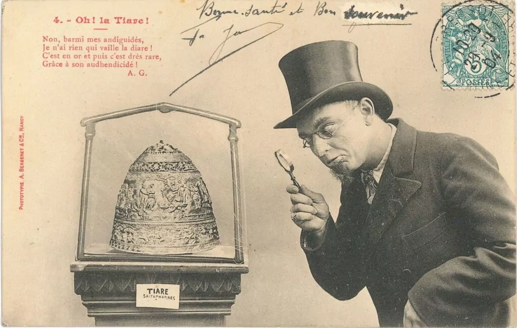 1 апреля 1896 года Лувр выкупил у двух продавцов из Российской империи тиару скифского царя Сайтаферна. Эксперты изучили ее и подтвердили подлинность, поэтому музей отдал 200 тысяч франков (примерно 1,85 миллиона евро по современному курсу) за экспонат. Cразу после того, как тиару выставили напоказ, СМИ начали писать, что это фальшивка, но в Лувре отвергали все сомнения. Только спустя семь лет обман раскрылся: нашелся изготовитель тиары — ювелир из Одессы․ Он сказал, что просто выполнял заказ. Как братья из Очакова обманули всех — в материале «Холода».