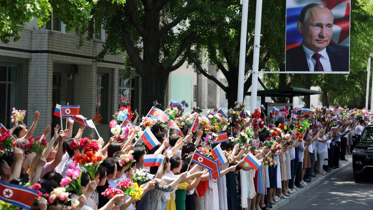North Koreans greet a motorcade carrying Vladimir Putin and North Korean dictator Kim Jong Un through Pyongyang during the Russian leader’s brief visit to the country on 19 June 2024. Photo: EPA/GAVRIIL GRIGOROV