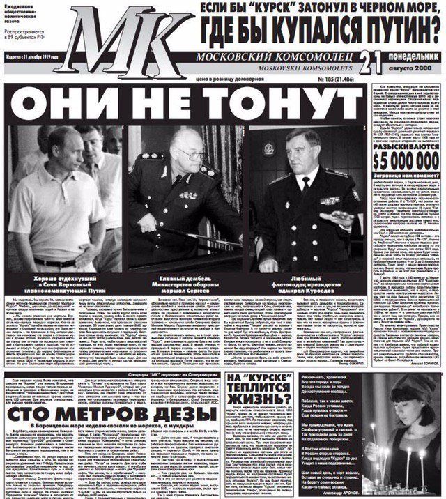 Трагедия «Курска» была самым долгим расследованием «Новой газеты», и моя коллега Лена Милашина сумела доказать, что моряков убил пофигизм и разгильдяйство Минобороны и государства. Потом то же Минобороны и Генпрокуратура даже пытались судиться с нашей газетой. Но Милашина через ЕСПЧ доказала, что не соврала ни в одной букве. Так что России суд даже велел заплатить «Новой газете» компенсацию. Так что все, кто хотят знать правду – с легкостью могут себе это позволить.