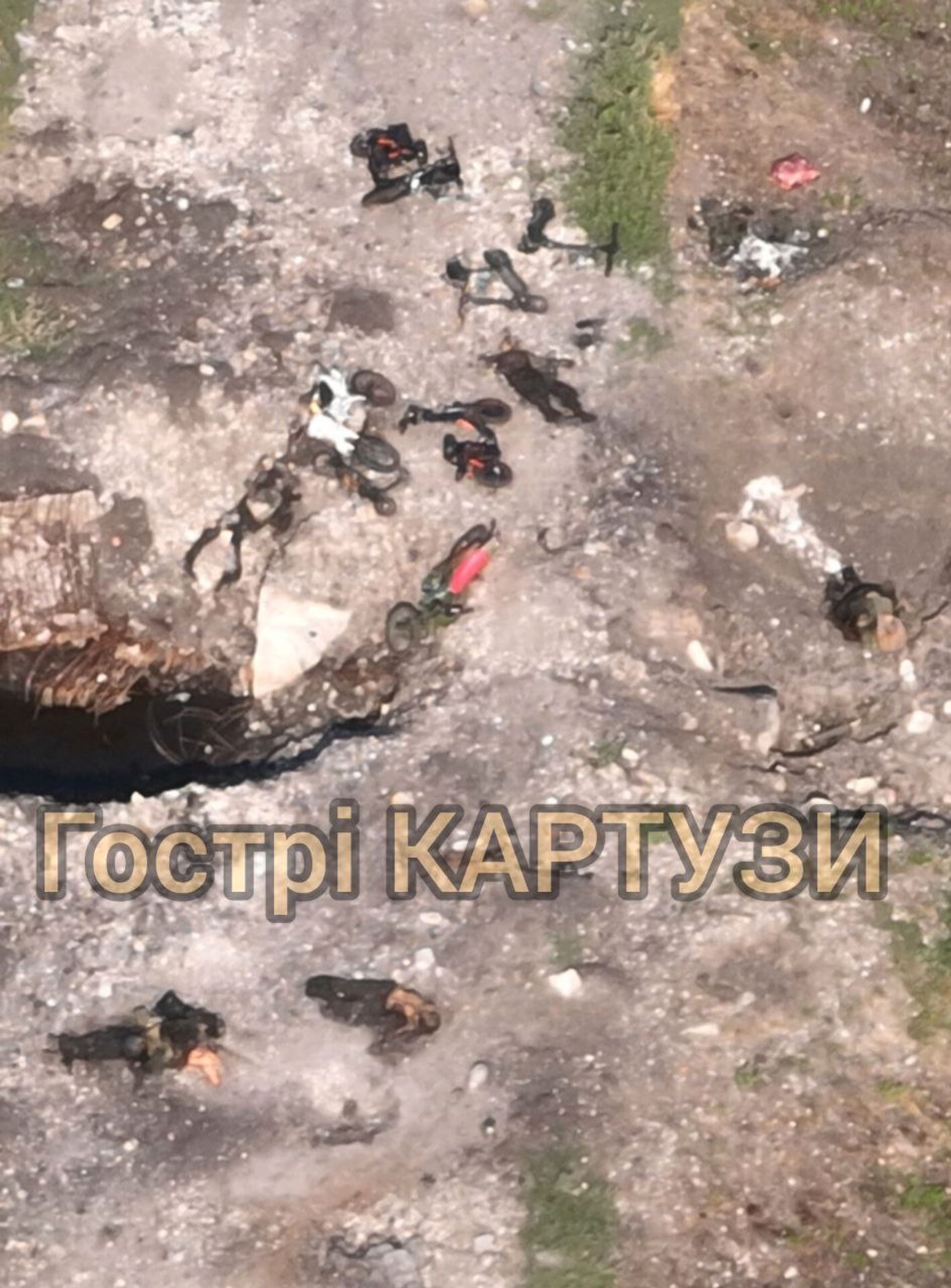 Тем временем беспилотное подразделение «Гострі Картузи» Центра специального назначения «Омега» Нацгвардии Украины опубликовало кадры последствий отражения российского мотоштурма на покровском направлении.