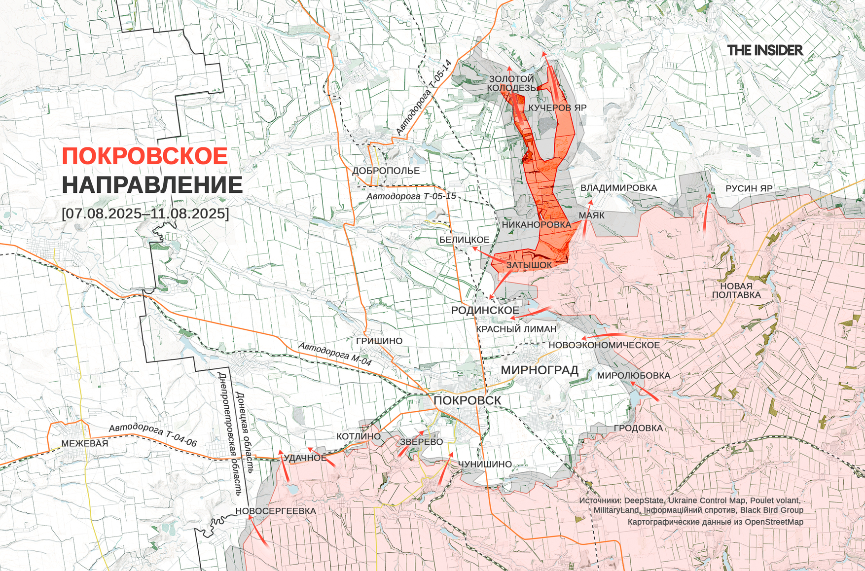 Украинский военнослужащий Станислав Бунятов рассказывает, что в Покровск заходят малые группы «смертников» с задачей устраивать засады и вносить хаос в украинскую оборону. Его коллега, автор канала «Бахмутський Демон 👹», заявляет о попытке штурма и закрепления в Покровске большим количеством живой силы в ночь и под утро 10 августа. По его сведениям, большая часть российских штурмовиков погибла. По версии Анатолия Радова, ВС РФ удалось закрепиться на небольшом участке на южной окраине города.