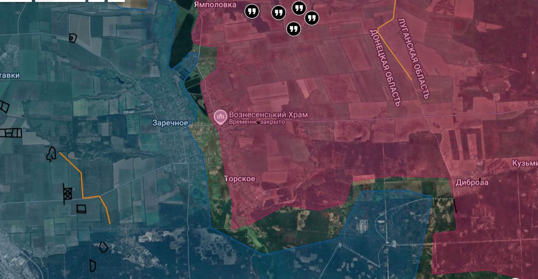 «Военкор» Юрий Котенок рассказывает о боях за Среднее, Колодези и Мирное, а также у северо-восточной окраины Шандриголова. Он также сообщает о боях в южной части Торского и отражении контратак СОУ со стороны Заречного (до 2016 года — Кировск) и Ямполя, а также о попытках захода российских штурмовиков в само Заречное по мосту. Анатолий Радов подтверждает бои за Среднее и Колодези и в районе Шандриголова, а также пишет, что ВС РФ продвигаются в Серебрянском лесничестве (что фиксирует и DeepState). Юрий Котенок полагает, что российское командование на этом участке намерено окружить противника. Говоря о районе Торского, Радов упоминал отсутствие успехов ВС РФ в Заречном и Рыбхозе. Позже военблогер сообщил о полном контроле российских военных над Торским.