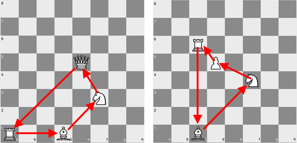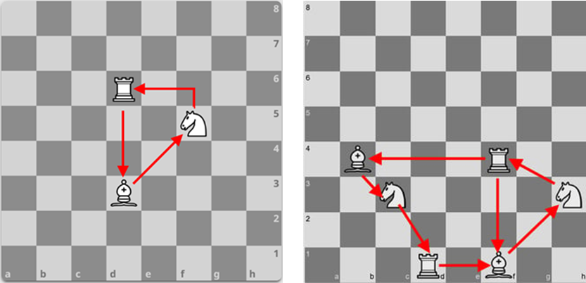 Например, слона, коня и ладью можно поставить на доску так, что они будут атаковать друг друга по принципу «камень, ножницы, бумага»: слон бьет коня, конь — ладью, ладья — слона (круг замкнулся). На диаграммах ниже показаны два цикла такого типа — самый короткий (слева) и подлиннее (справа).