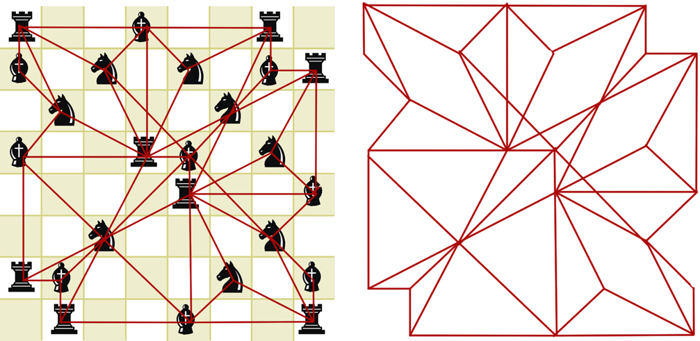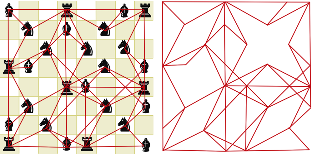 Вот пример одной из таких задач в этой книге: «При каком наибольшем P на обычной доске можно расставить P ладей, P слонов и P коней так, чтобы ни одна из фигур не угрожала другой?» Ответ там же: при P = 4 (всего 12 фигур).