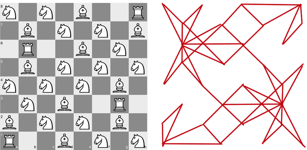 А вот ее решение с 22 фигурами — зато полностью симметричное. Она пишет: «Может быть, я изначально шла не за количеством, но за красотой и симметрией — и смотрите, какой совершенно центрально симметричный рисунок с рядом внутренних зеркальных симметрий! У меня фигуры „плотнее“: скажем, каждый конь бьет по две ладьи. А у RobPratt — по одной».