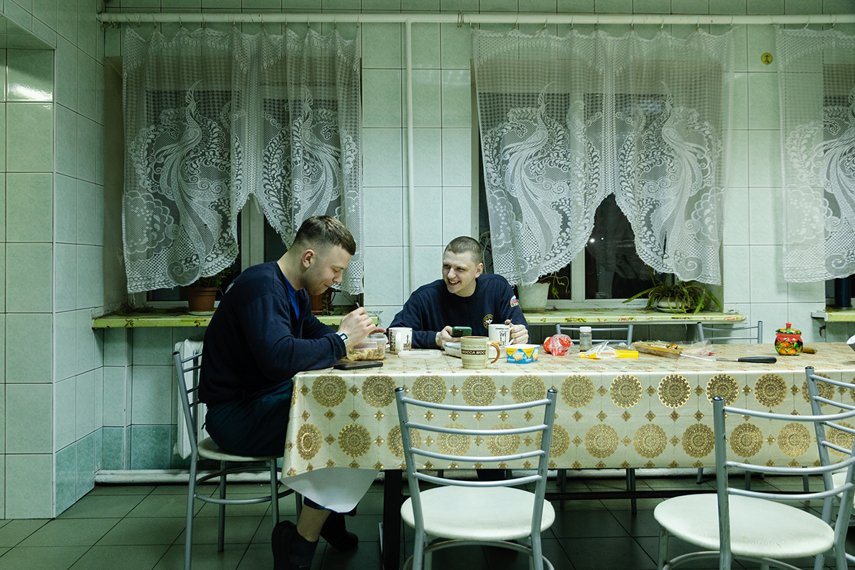 Евгений ОрловФото: Дарья Калнина Никто никогда не знает, что случится сегодня. Иногда мы можем положиться на предчувствие, но довериться ему полностью невозможно. Сам день может быть размеренным и неторопливым. Отсутствие вызовов будто останавливает течение времени в части, превращая день во что-то бесконечно тянущееся. При отсутствии задач ожидание утомляет. Но рутинные дела помогают времени идти быстрее. Кто-то убирает территорию, кто-то проверяет оборудование, а кто-то готовит на кухне. Отдыхают здесь, как правило, за игрой в приставку или при просмотре кино. А около двух часов дня все погружается в тишину: приходит время безмятежного отдыха на диване в телевизионной комнате. И только редкие отзвуки игры в настольный теннис идут из учебного класса, где кто-то сделал выбор в пользу активного отдыха. Чтобы сыграть, нужно отстоять очередь. Сама игра идет оживленно. Снимать ее довольно опасно, но весьма увлекательно. Особенно приятно ловить моменты радости, улыбок и смеха. Здесь ты видишь других людей.