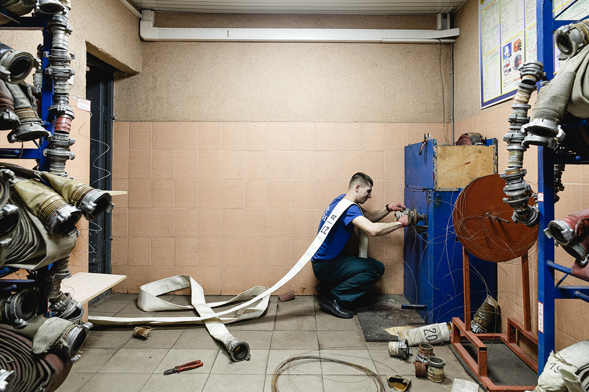 Егор ремонтирует пожарные рукава, апрель 2024 годаФото: Дарья Калнина Но как бы то ни было, пожарные выезжают на вызов.