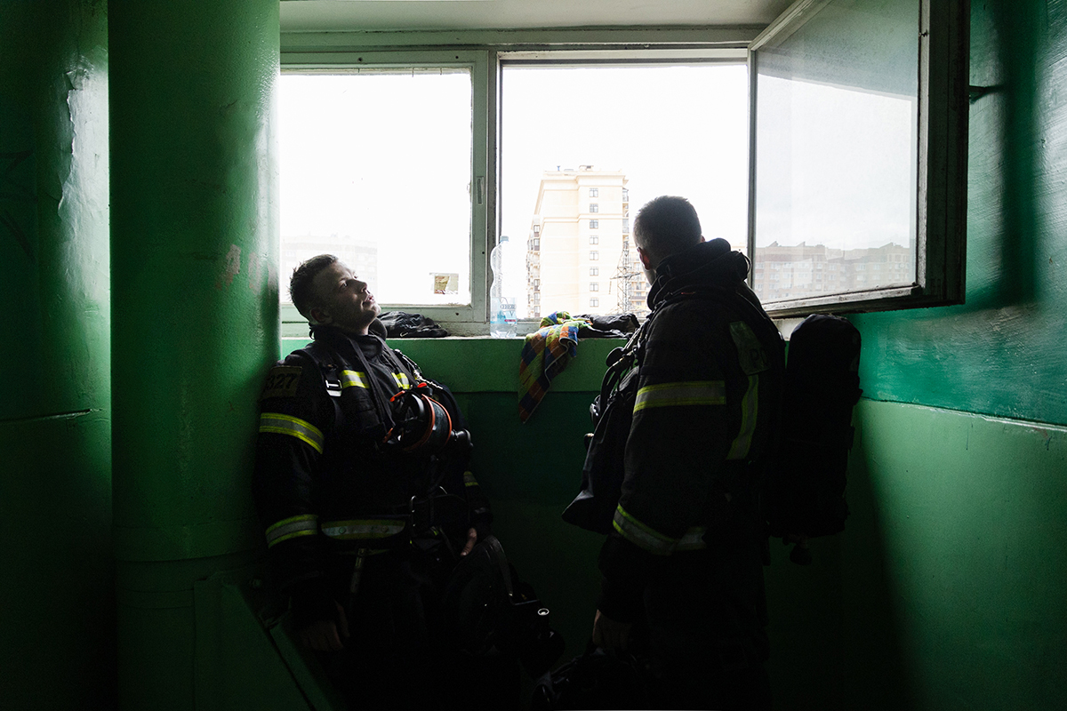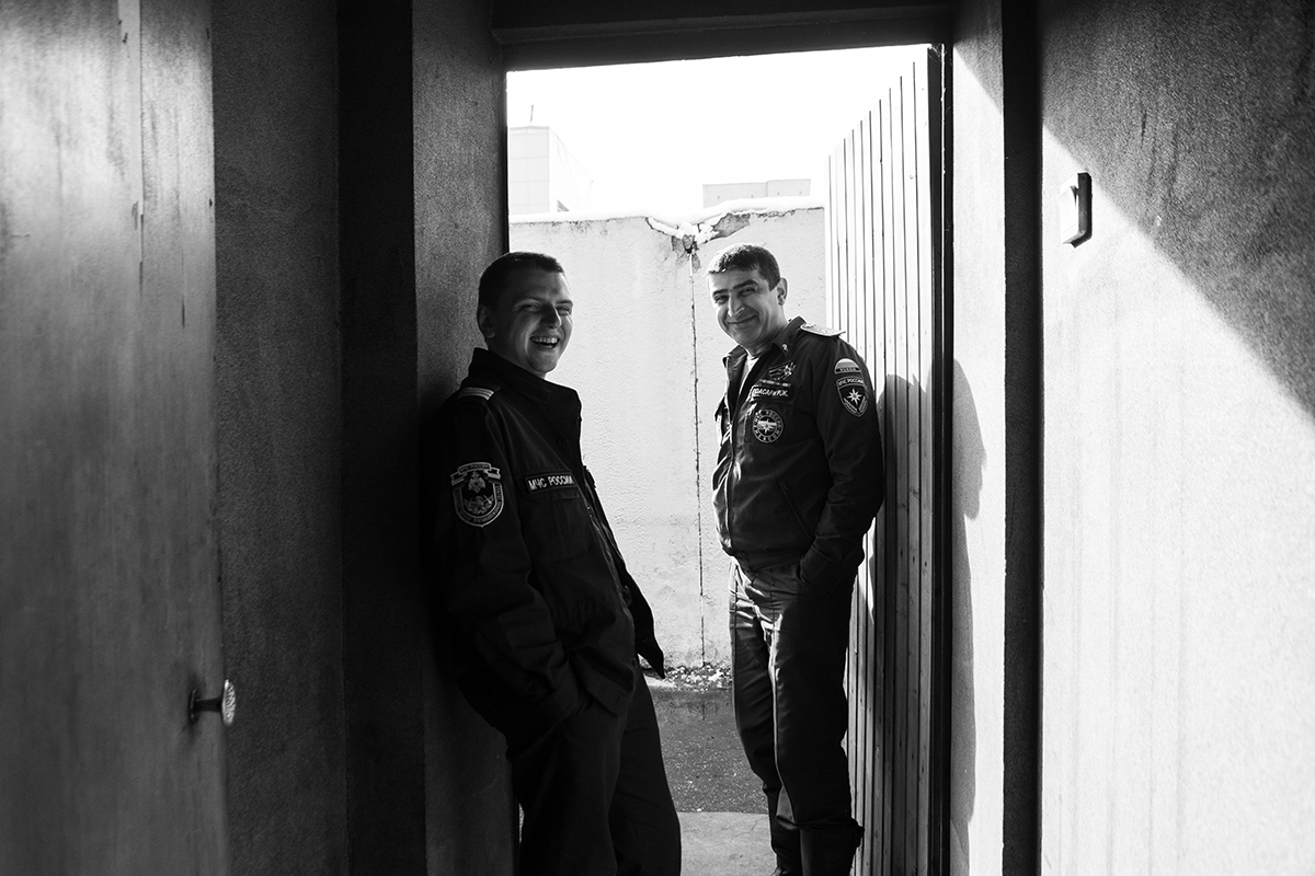 Пожарные Даня и Витя отдыхают после тушения квартиры. Люберцы. Май 2024 годаФото: Дарья Калнина «Поначалу эмоции были, эйфория, все-таки пожарная охрана. Мне хотелось помогать, выручать, и как-то я не задумывался, что люди-то страдают. Мне хотелось на пожар попасть. А сейчас я просто не хочу, чтобы у кого-то беда случилась».
