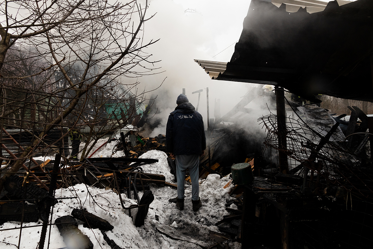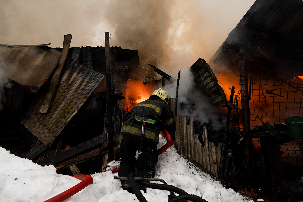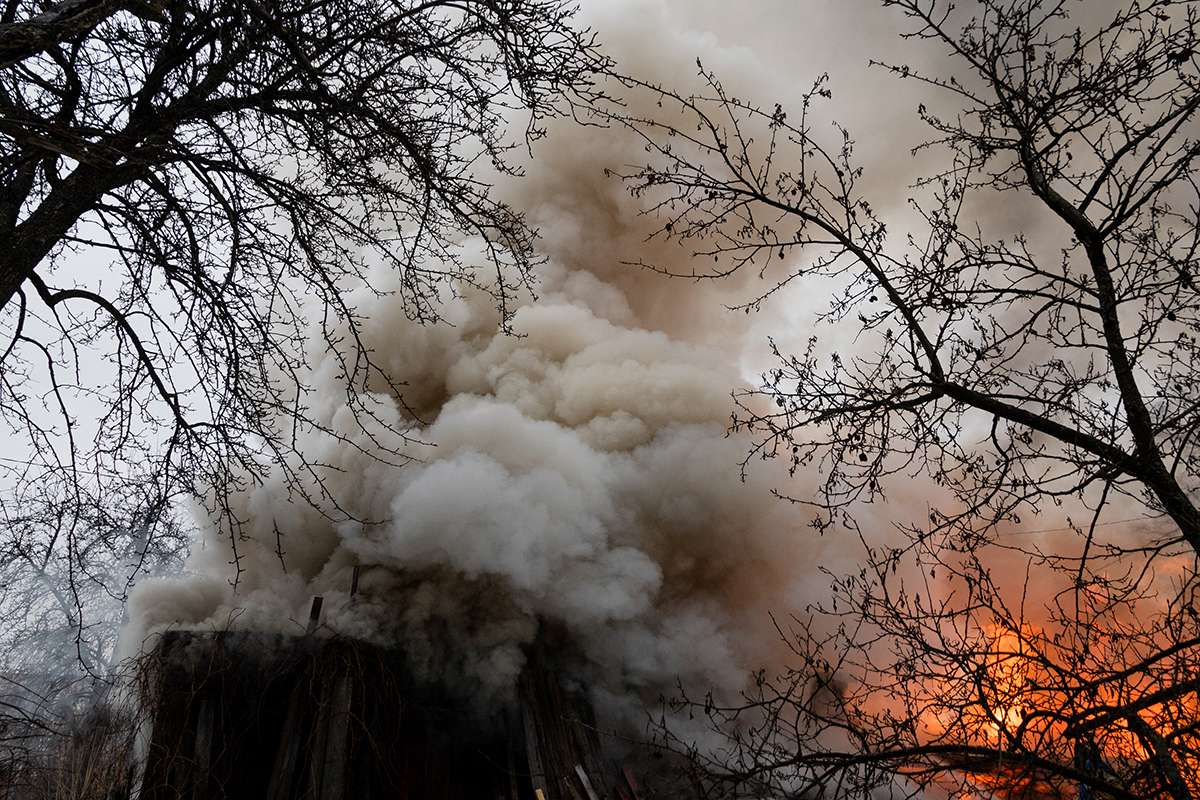Дым от поленницы, 18 марта 2024 годаФото: Дарья Калнина На заднем дворе частного дома горел старый сарай, в котором хранились дрова. Огонь был сильным. Сугробы мешали пройти к очагу, пожарные с трудом пробирались через снег. В какой-то момент я услышала крик: «Даша, не мешайся» — и быстро отошла в сторону. В этот момент прокладывали рукава. Я обошла дом и подошла к огню. Окно задней части дома уже было выбито. Огонь заливали водой. В какой-то момент я услышала крик. Он принадлежал одному из пожарных. Это было воздействие температуры. Она подступала к коже, причиняя боль всему телу. Все то время, что пожарные пытались потушить огонь, владелец дома находился рядом с ними. Он отчаянно пытался закидать горящие участки снегом. Это не помогало. Но он хотел помочь, он не знал, что еще сделать. Его жена просила его вернуться в дом, пожарные говорили не мешать и не подвергать себя опасности, но он не слышал. Его удалось увести в дом только сотрудникам скорой. Лишь спустя время, когда остался только дым, он вышел посмотреть на последствия огня.