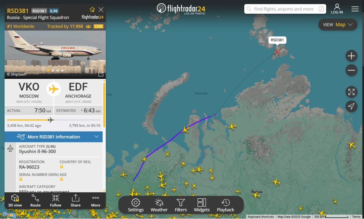 Самолет Ил-96 летного отряда «Россия» с бортовым номером RA-96023, который обслуживает первых лиц государства, в 7:50 по Москве 14 августа вылетел из Москвы в Анкоридж, где должна состояться встреча Владимира Путина с Дональдом Трампом, свидетельствуют данные Flightradar. В аэропорт назначения борт должен прибыть в 17:43 по Москве.