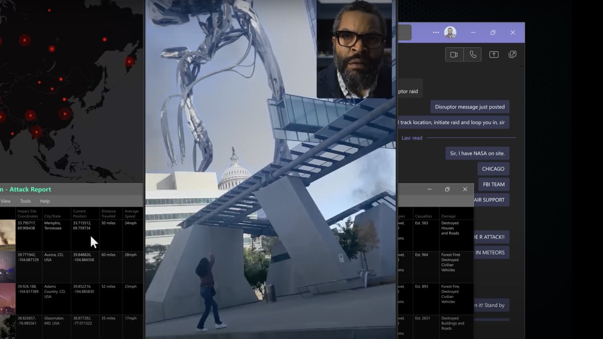 В результате комически преувеличенными выглядят буквально все сюжетные коллизии. Зритель элементарно не успевает за отведенное время испугаться инопланетных захватчиков и уверовать в мессианские качества семейства Рэдфорд, которое — разумеется — и спасет человечество. Причем важные роли сыграют папа (инсайдер в правительстве), дочь (биолог, которая изобретет оружие против пришельцев) и сын (как выясняется, хакер).