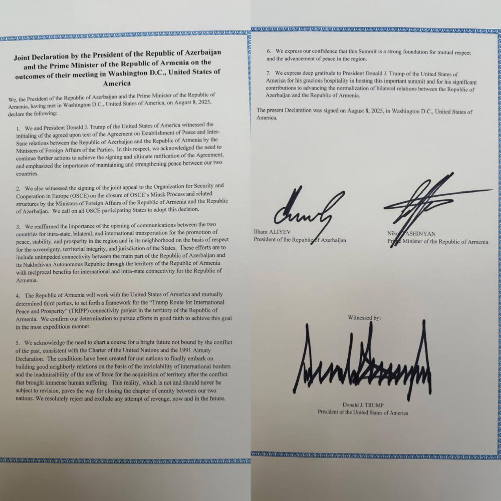 Лидеры Армении и Азербайджана Никол Пашинян и Ильхам Алиев 8 августа подписали декларацию о намерении заключить мир. Это произошло в присутствии президента США Дональда Трампа, который также поставил свою подпись под документом. В нескольких пунктах декларации сообщалось, что Ереван и Баку согласовали текст договора о мире, обратились к ОБСЕ с просьбой распустить Минскую группу, а также договорились разблокировать коммуникации между странами, включая беспрепятственное сообщение между Азербайджаном и Нахичеванским эксклавом через территорию Армении. Эксклюзивные права на развитие стратегического транзитного коридора через Южный Кавказ получили США, проект назвали «Международный маршрут мира и процветания Трампа» (TRIPP).