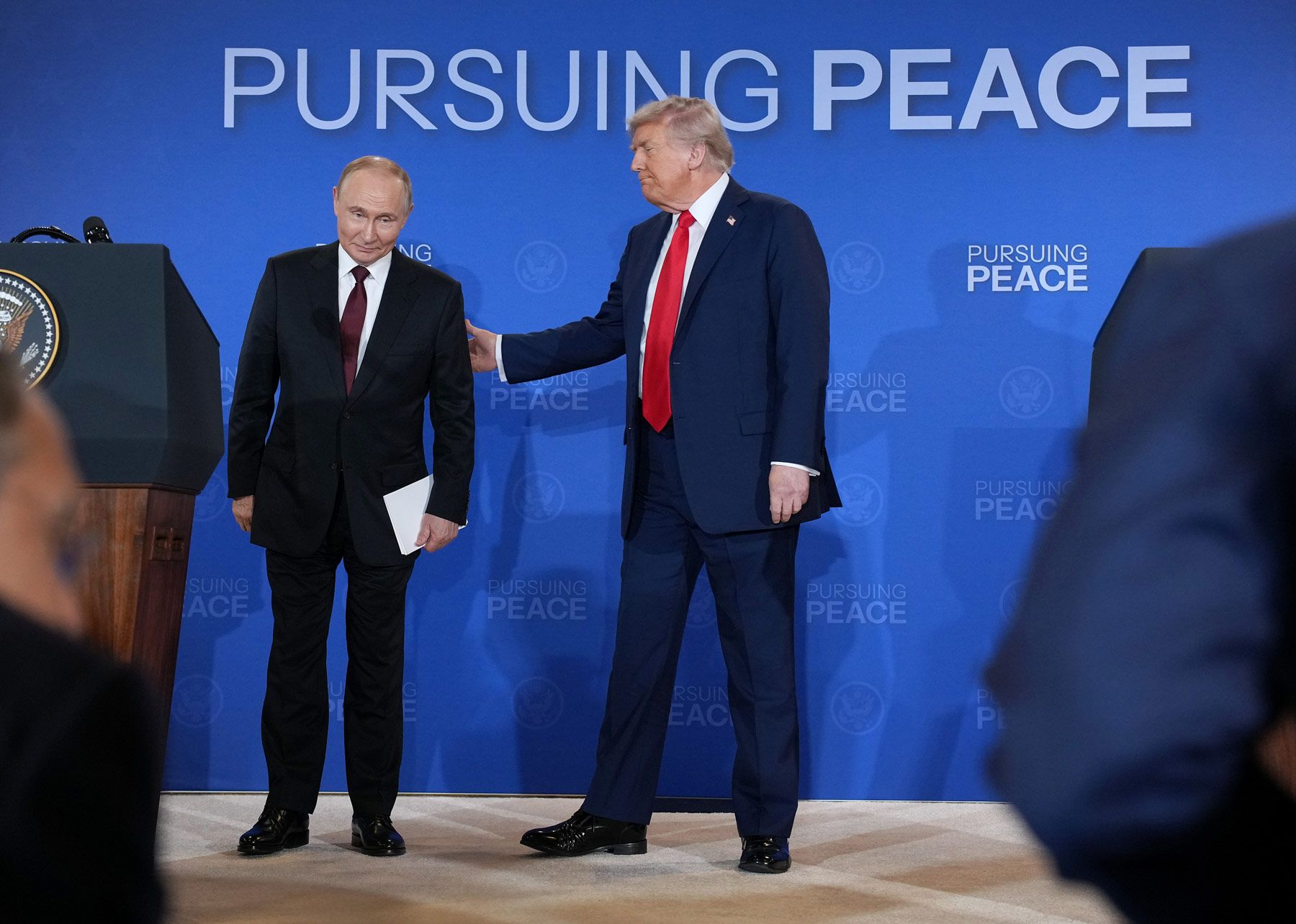 Трамп, в свою очередь, сказал, что «сделки пока нет», но при этом стороны «добились существенного прогресса» и вновь выразил уверенность, что Путин хочет завершить войну. Президент США заявил, что вскоре снова надеется увидеться с Путиным, на что тот по-английски спросил: «Next time in Moscow?». Затем президенты покинули зал, не став отвечать на вопросы журналистов.