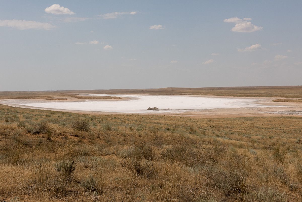 Зеркально-голубые, отражающие небо озера с мохнатой зеленью вокруг чередуются с разбросанными посреди иссушенной на солнце травы белыми пятнами, которые издали можно принять за снег. Это солончаки — засоленные остатки озер, исчезающих из-за маловодья.