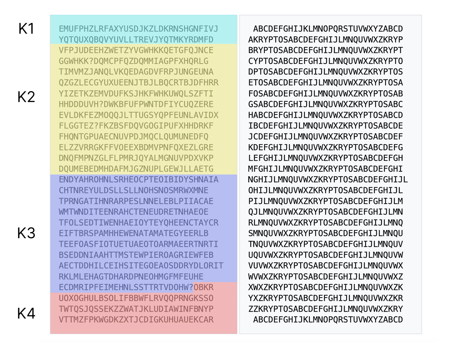K1 и K2 закодированы шифрами Виженера — каждая буква сдвигается по алфавиту в соответствии с буквами секретного ключа. (Ключ для K1 — «палимпсест», а для K2 — «абсцисса»). K3 закодирован шифром перестановки, где буквы остаются сами собой, но переставляются.
