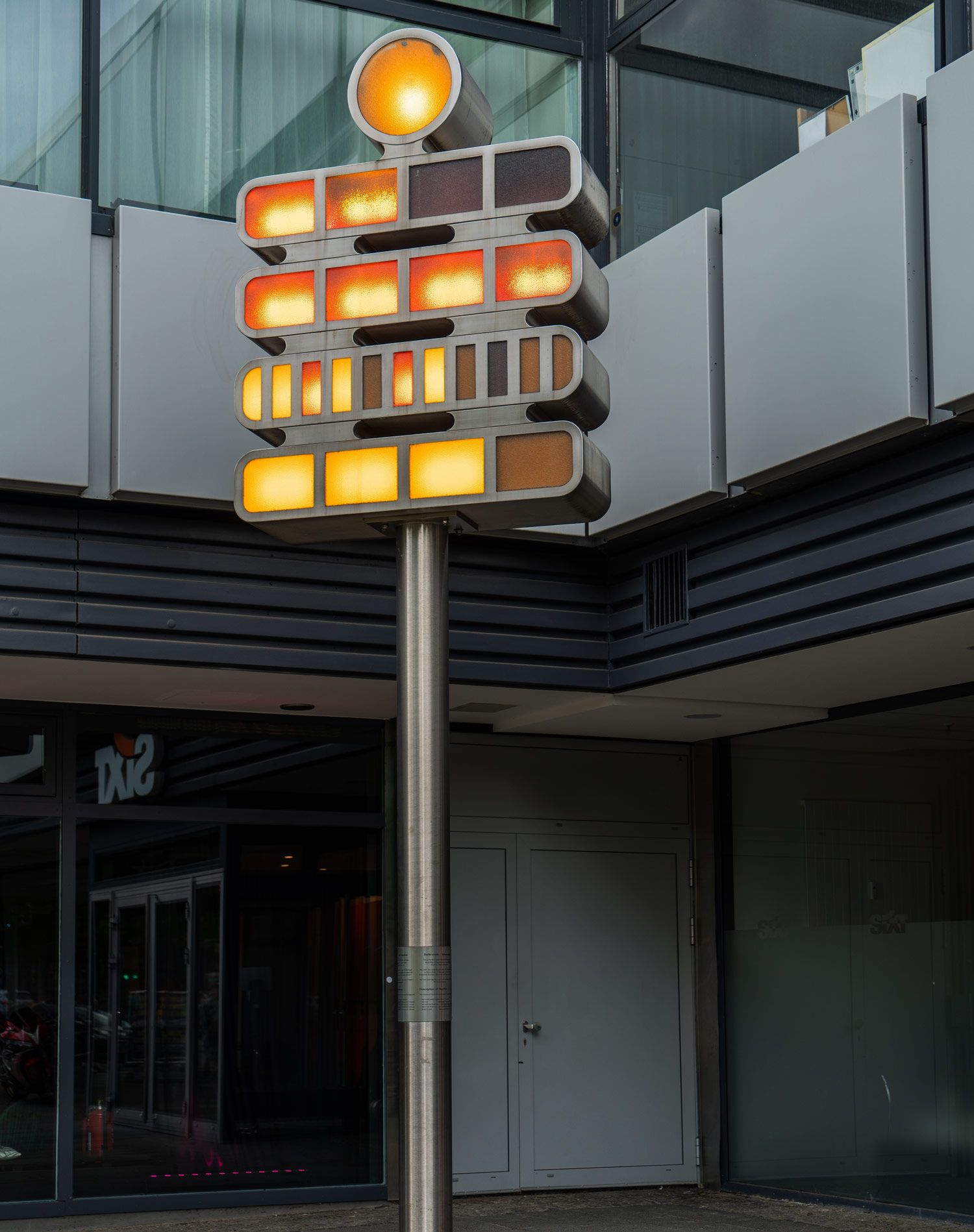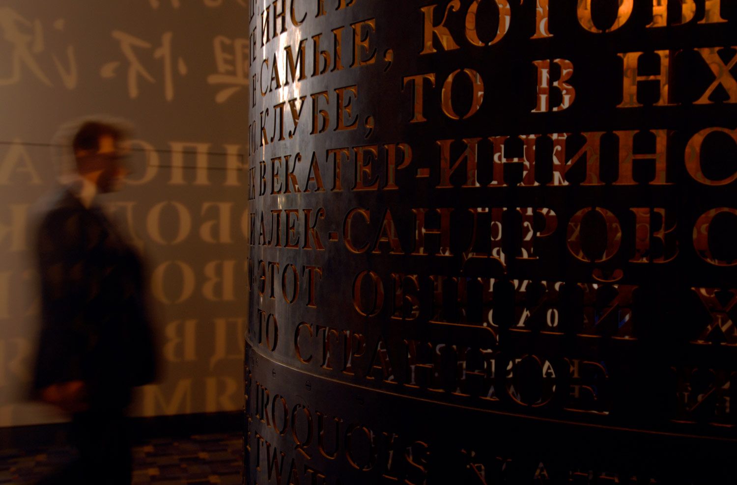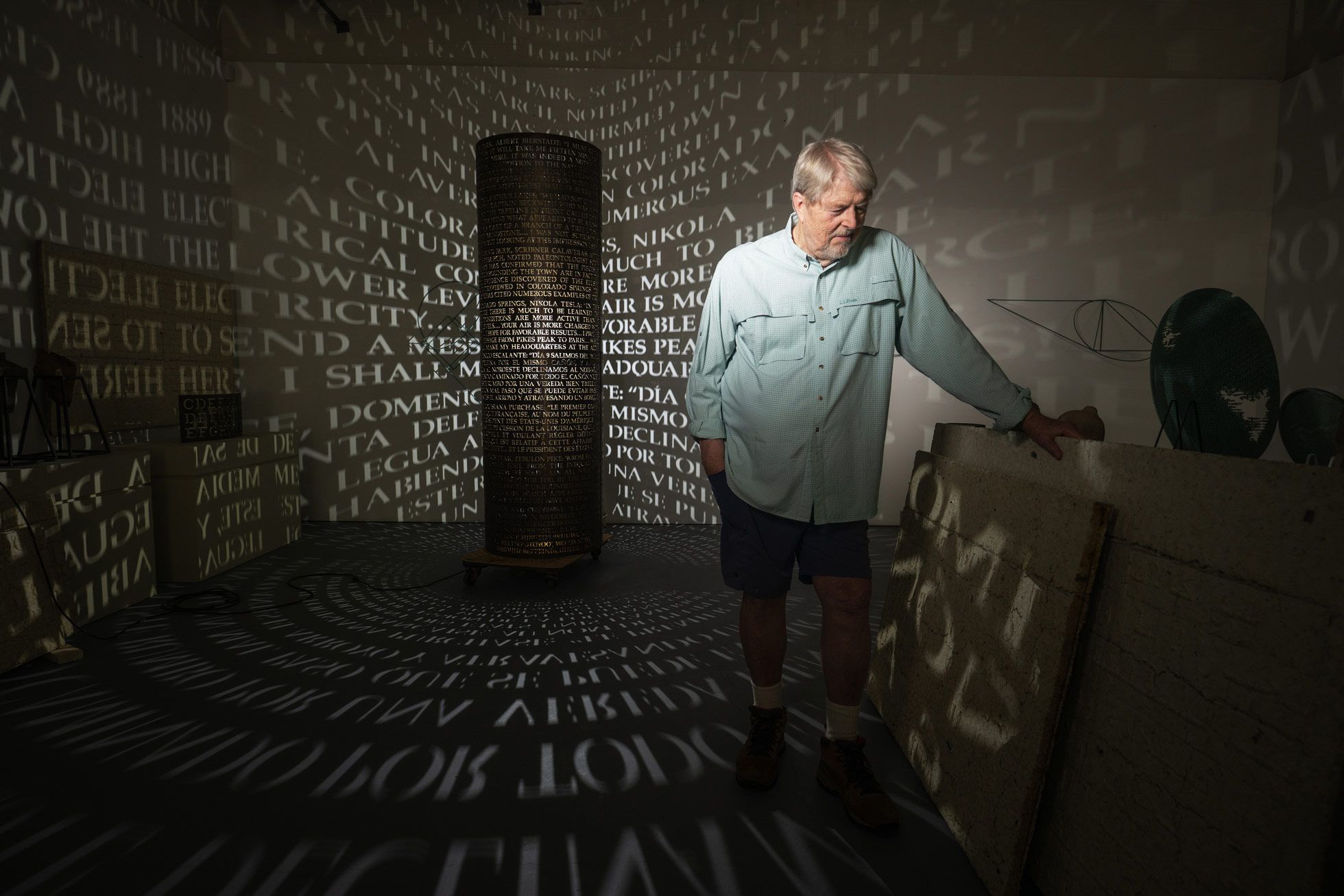 Сэнборн усовершенствовал серию бронзовых цилиндров, украшенных перфорированными буквами, которые проецируются в окружающее пространство благодаря источнику света в центре. По сути, это близнецы «Криптос», свернутые в вертикальные буррито. Эти цилиндры стали узнаваемыми. Единственная проблема заключалась в том, что в студенческих кампусах, где они стояли, их часто заполняли пустыми пивными банками. «Все тексты на них связаны с историей», — говорит Сэнборн. «Что-то из них фактическое, что-то — вымышленное. То есть я и сам иногда выдумываю».